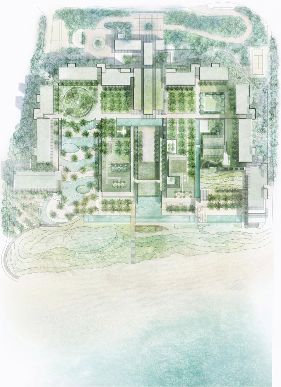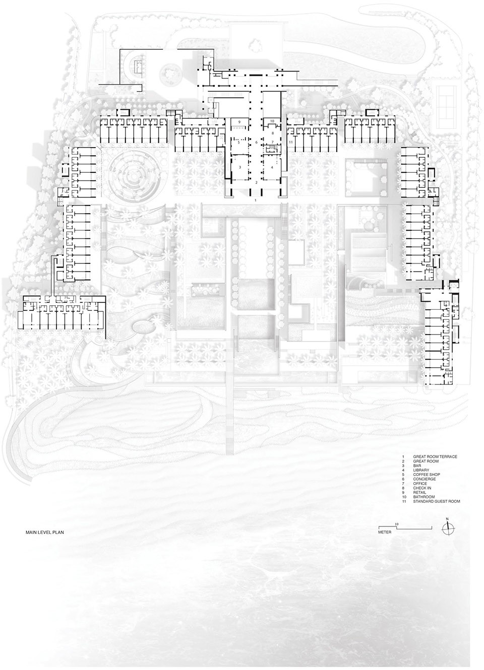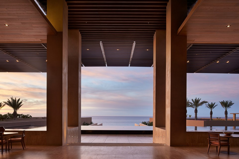 纵然酒店与一望无际的太平洋之间被一道高35英尺,延绵750英尺的沙丘地带相隔,其水平向延展的大堂空间以及贯穿其中,如同巷道般纵横交错的路径仍然成功地让甫入酒店的人们感受到与大海的紧密联系。