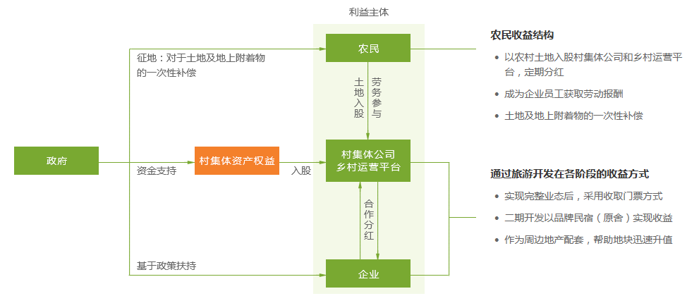 农民以农村土地入股村集体公司和乡村运营平台,定期分红,同时成为企业员工获取劳动报酬,另外也可获取土地及地上附着物的一次性补偿。