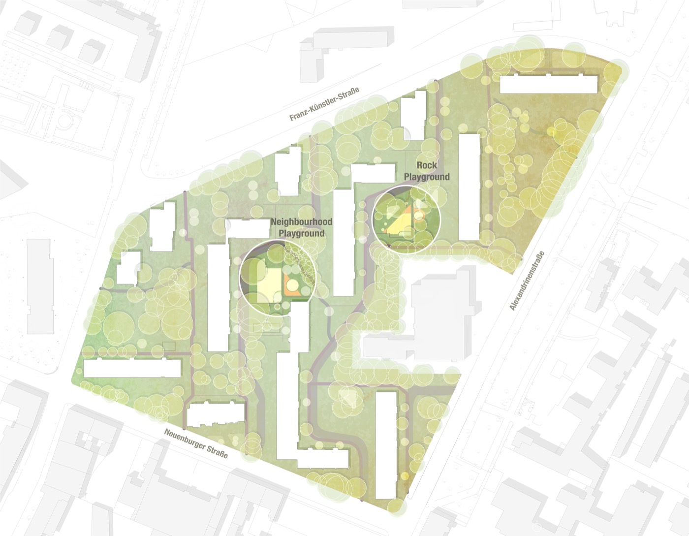 Springsiedlung 建于 1960 年代,是那个时代的城市象征。它由高达 8 层的开放式建筑组成,绿地比例很高。这种开放式的建造方式创造了一个公园般的绿地,对周围的城市空间具有很强的通透性。作为整个社区和开放空间重建的一部分,我们的任务是使游乐区适应当今的社会和生态要求。
