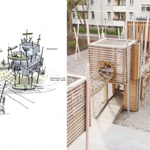 为了建立对定居点整体概念的设计参考,游乐区是通过几何游戏立方体与建筑相关联的。它们被理解为介于高层开发和广阔开放空间之间的中间层或中介。形式语言来源于圆形、方形和线的基本几何形状。钢棒被用来创造一个有节奏的交错高度。为了与当时的设计方法保持一致,不仅采用了形式语言,还采用了配色方案。外墙、阳台和铺路的淡粉色、蓝色和黄色的原始色彩概念不仅反映在游乐设备中,而且还出现在附近其他地方的家具中。