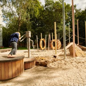 除了两个中央游乐区外,沿路的某些点还集成了非正式游乐设施。它们可以刺激日常生活中的运动,也适用于成年人。例如,这些是由木材和石头等不同天然材料制成的平衡产品。由于其非传统的形状,它们具有多功能特性,也可用作座椅元件。