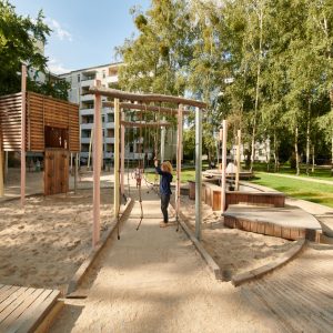 本着可持续社区的精神,“岩石游乐场”创造了一种亲近自然的体验。这里有天然形成的水石、水泵、带有大石灰岩洞穴的石头景观,以及攀登路线和墙壁。各种可食用的多年生和灌木植物果实的“小吃岛”,以及芳香、昆虫友好的植物,增加了环境教育价值。游乐区和休闲区两旁是大面积的蜜蜂牧场,以及灌木和灌木的景观区。