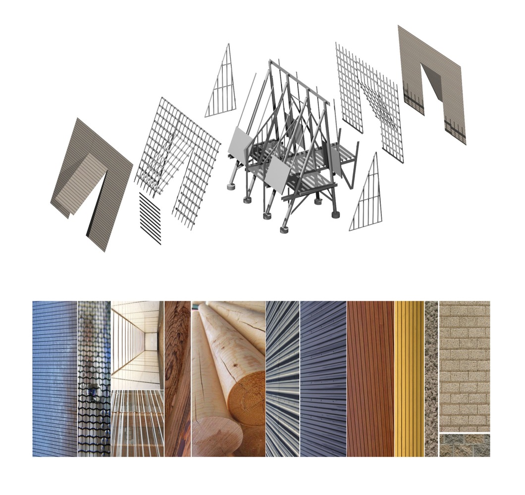 精益的框架由与最基本的基础设施相同的简单杆件构成。这些杆子适宜地与树木并排站立着。作为一个产品,选择杆件是经济的,而且可以达到所需的13.7米长度。为了将长杆连接到基座,工人在现场钢板上锯出一个切口,用于将结构固定。
