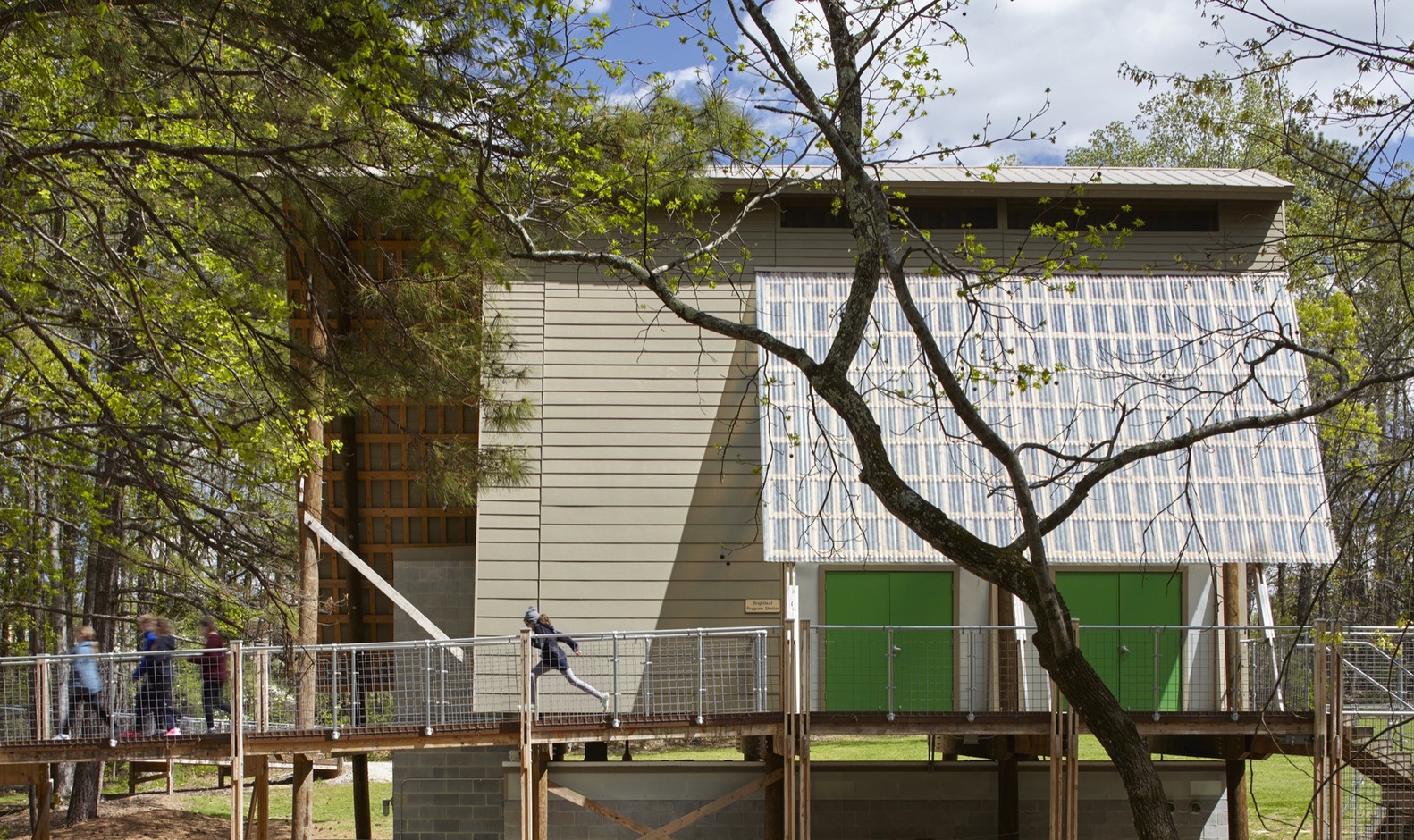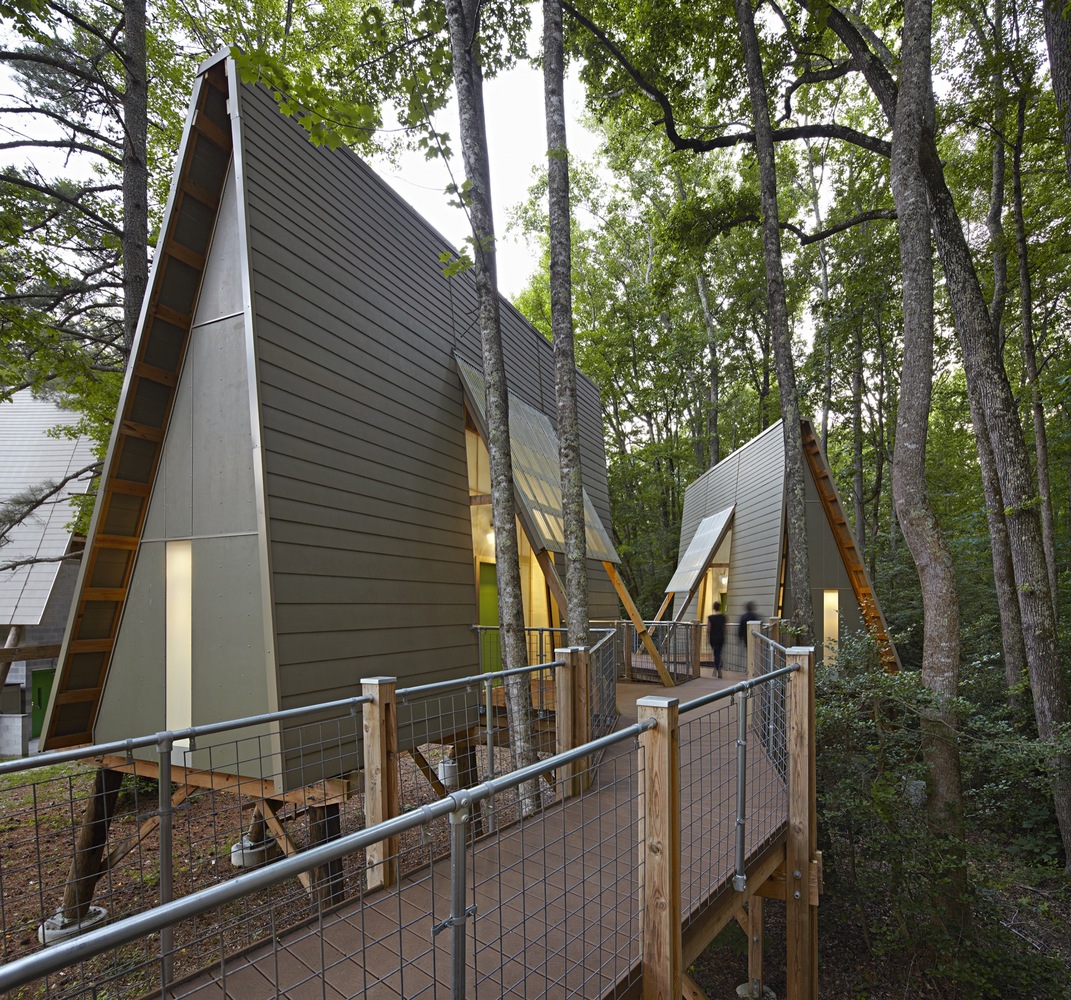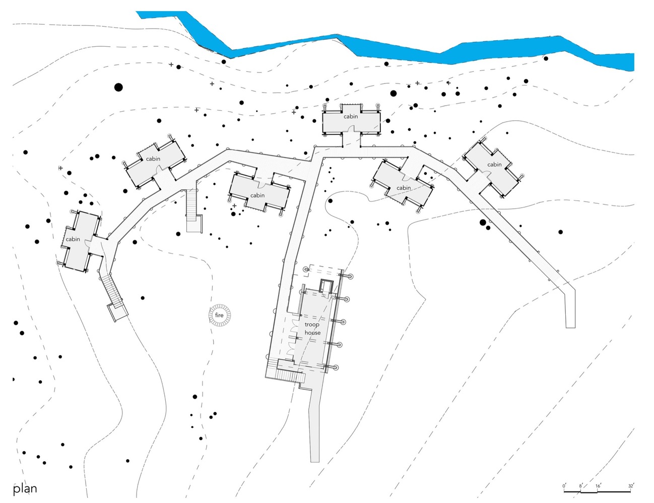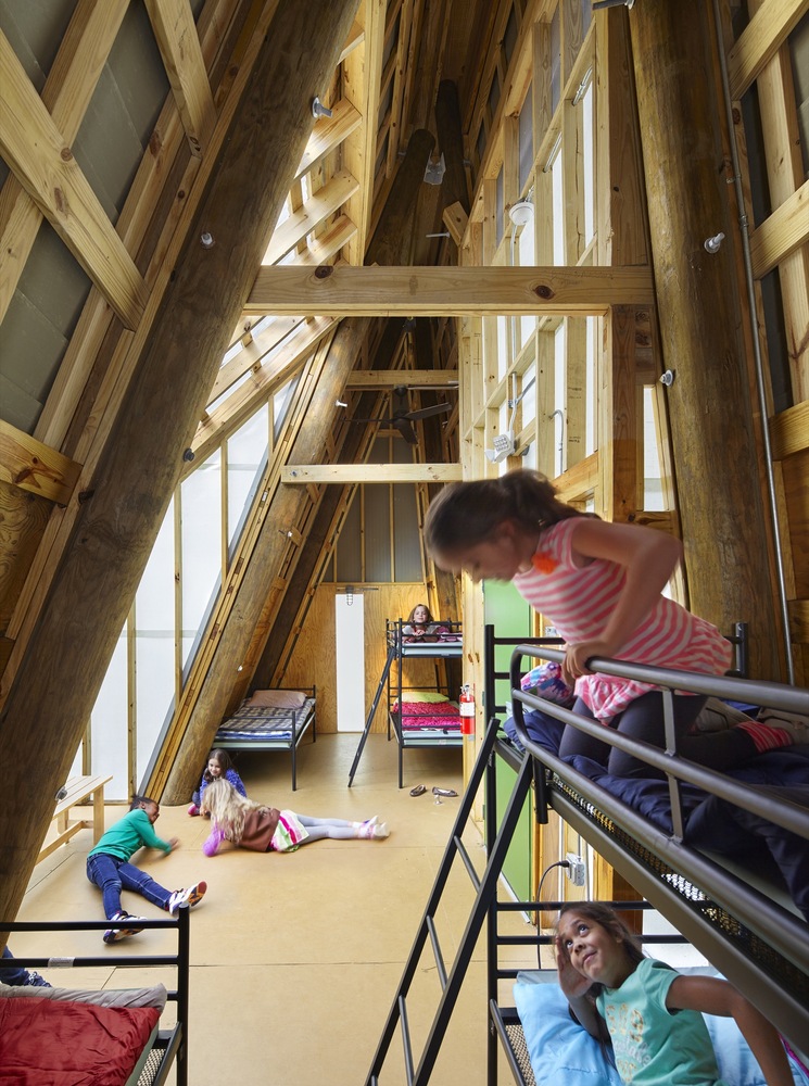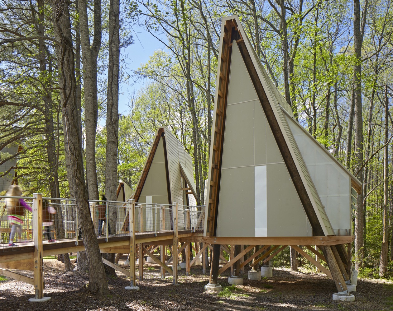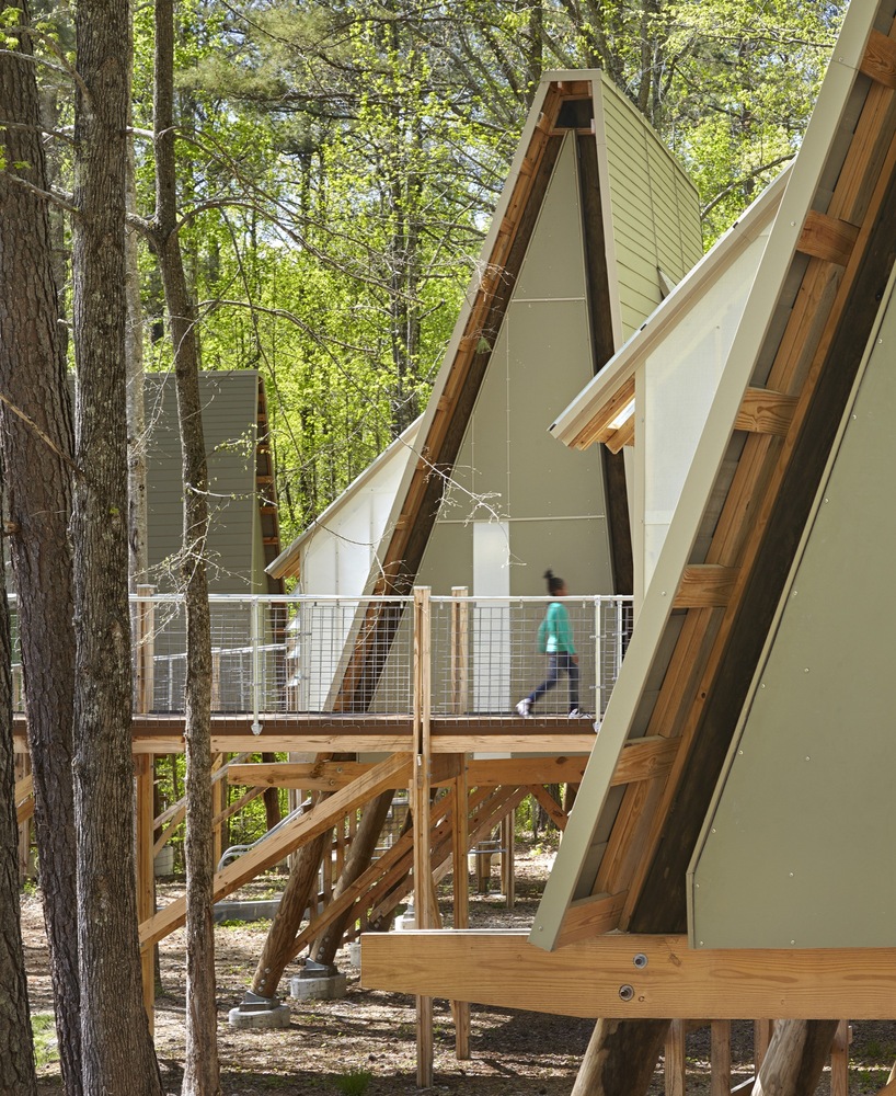 在湖边营地上搭建帐篷和小木屋露营,是一项十分诱人的户外活动。于是,一个女童子军组织开始在此地建造一种别样的营地。他们想要建造树屋,因为这可以唤起参与者探险的感觉,引发无限幻想,体验那种站在自家后院或森林入口处看到高大构筑物的喜悦感。在Graham营地,一座可容纳36人的建筑沿着树林边缘由一系列木桩结构组成。每个树屋之间由架起的小路连接,这些小路蜿蜒于当地树木的树干之间。树屋的挑战是在不伤害树木的前提下进行建造,并尽量使更多露营者有机会入住。