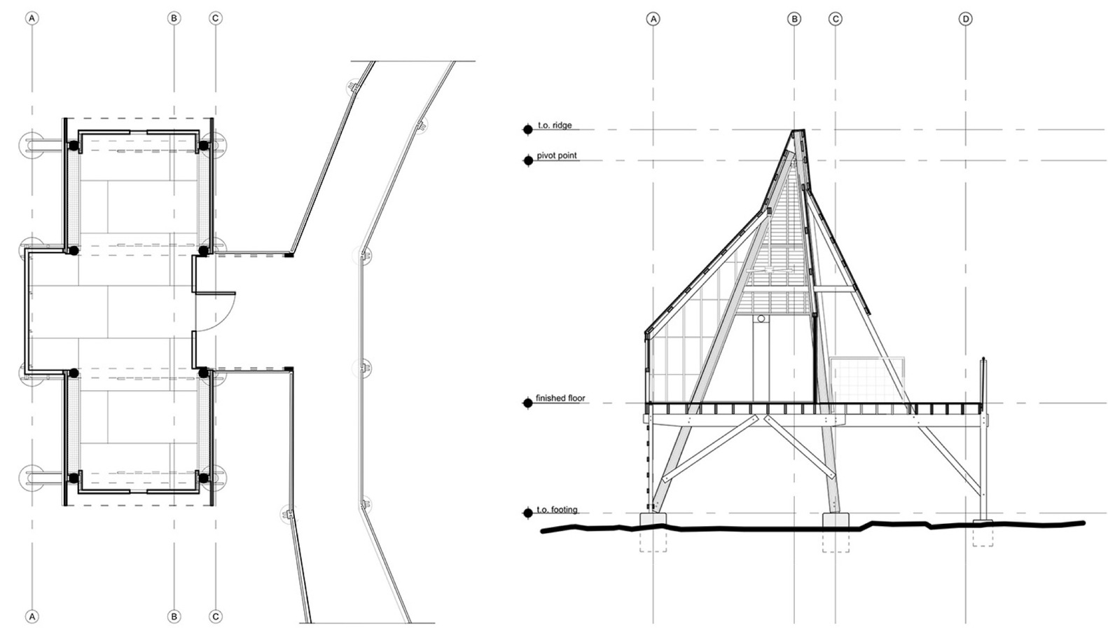 Graham营地的结构框架支撑在轻轻接触地面的高木桩上。这些木桩之间互相倾斜,与周围环境和不规则生长的树干相似,成为森林的一部分。树屋框架从在屋顶上延伸下来,在框架之间填补了实体和半透明材料。穿过天然树冠的斑驳阳光在穿过这层界面的时候被戏剧化的吸收或穿透。每个全天候树屋可容纳六个露营者的床铺和婴儿床,每个树屋都包括一个核心阳光房,和一处可供大家玩乐的地方。
