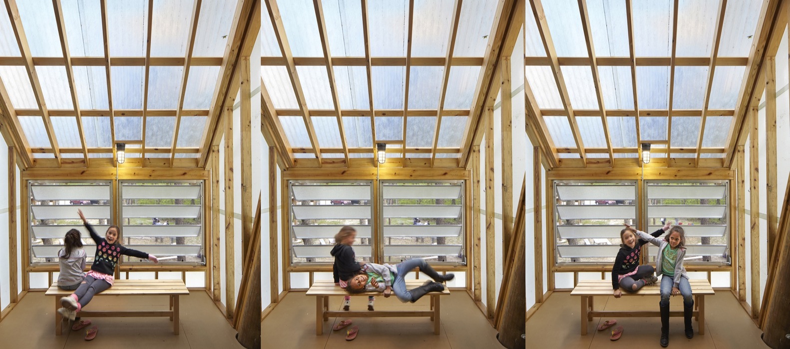 条状形式的天花板从头顶一直向上延伸,直到触碰周围环境的树枝。端面板和地板的边缘在收尾处很短,允许产生缝隙槽,以促进空间的自然通风。