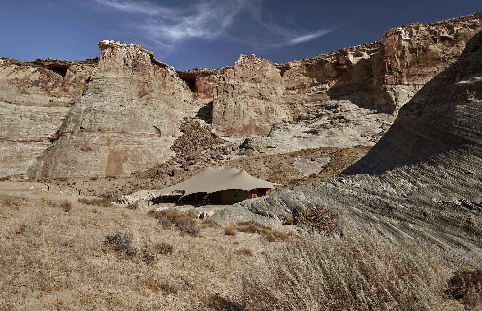 单卧室的帐篷约 176.5 平方米(1900 平方英尺),而双卧帐篷则提供超过 260.1 平方米(2800 平方英尺)的被帆布覆盖的温馨空间。为了与 Amangiri 的设计理念保持一致,所有的帐篷都是舒适宽敞的,线条简洁,色彩自然。此外,营地精致的细节反映了本地的纹理和天然材料,灵感来自于沙漠的起伏表面。