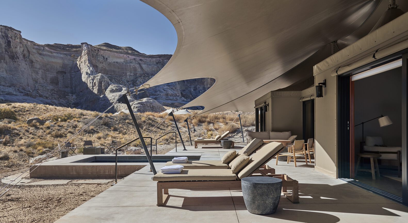 帐篷单元的室外区域同样美丽。穿过道格拉斯冷杉制作的推拉门,客人可以在私人温水游泳池中放松,在摆放着舒适躺椅的甲板上伸展,或者在篝火和炉边的家具周围聚集。甲板上的高度工程化的扩展帆布遮蔽了