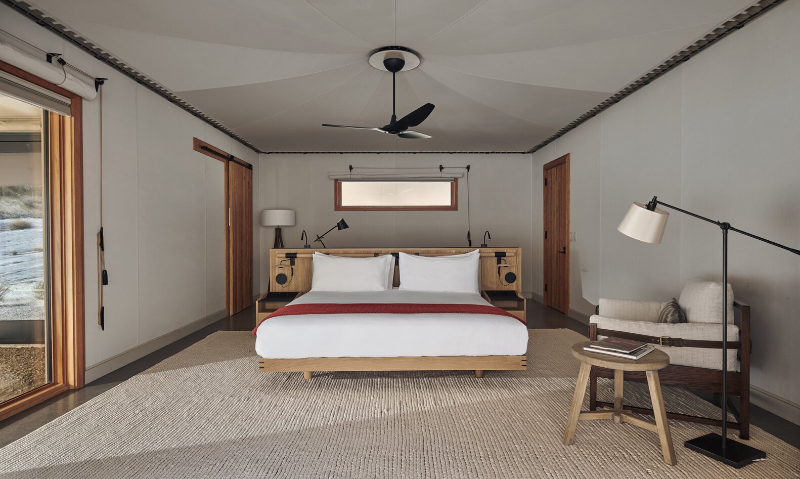在帐篷内部,Luxury Frontiers 定制的营地风格的胡桃木办公桌配备有抽屉,边上挂着放杂志和资料袋的皮革袋,并配有一把定制的活动椅,上面有精致的皮革装饰。大床和双人床的蚀刻木质床头参考了周围的雕刻景观,并以挂在皮带上的柔软坐垫作为装饰。 帐篷内的其他家具品牌包括 Nanimarquina, Annie Selke, Christian Liagre, My Home Collection, Marset, Dedon, COR 和 River Wood Mills 等等。