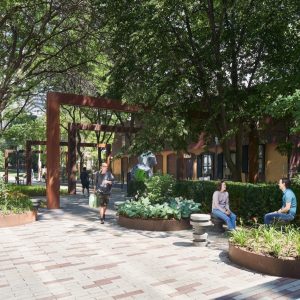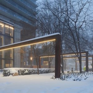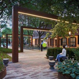 总体规划完成后,JRS 带领多学科顾问团队实现了 2021 年完成的詹姆斯康宁花园的振兴。为了保护现场美丽、成熟的刺槐树,使用空气铲和低矮的树木完成了密集的树木栽培调查。 - 压力真空技术以暴露、定位和绘制显着根部。根系由连接重要根部区域的定制设计基础保护。七个定制的照明耐候钢拱门,高 4.5 m,延伸穿过公园,提供温暖的照明水平、清晰的场地线条和独特的地方感。引人注目的特色灵感来自 1950 年代修建的央街地铁线,该地铁线位于公园系统的正下方。操场被搬迁到公园内一个更显眼和突出的区域,由一个多孔表面组成,高出树根。新的游乐元素包括无障碍游乐设施、平衡功能和大型攀爬结构。与当地制造商合作创建了不同高度和配置的定制预制混凝土凳子。遍布整个公园的俏皮凳子提供休闲场所,供您享用咖啡和与朋友讨论。由 Corten Steel 制成的定制圆形凸起花盆中充满了各种耐寒的多年生植物和春季球茎,增加了季节性的颜色和质地。该团队还与多伦多市交通部合作,提供了一个延伸到道路的植被林荫大道,使车辆减速并允许更短的人行横道。