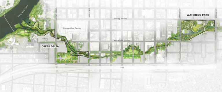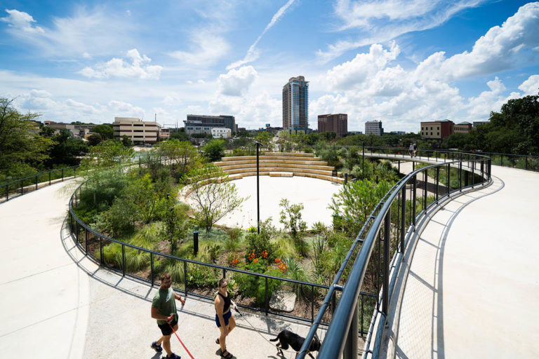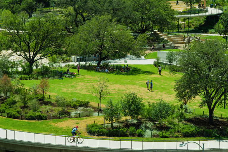 今年 8 月,得克萨斯州奥斯汀市中心滑铁卢公园的开放标志着一条穿过城市中心的曾经被渠道化和被忽视的城市小溪的第一阶段复兴工作已经完成。虽然计划于 2026 年完成的完整滑铁卢绿道公园系统将延伸约 1.5 英里,穿过市中心东部到伯德夫人湖,但位于该项目北端的占地 11 英亩的滑铁卢公园代表了沿线的旗舰开放空间沃勒溪走廊。