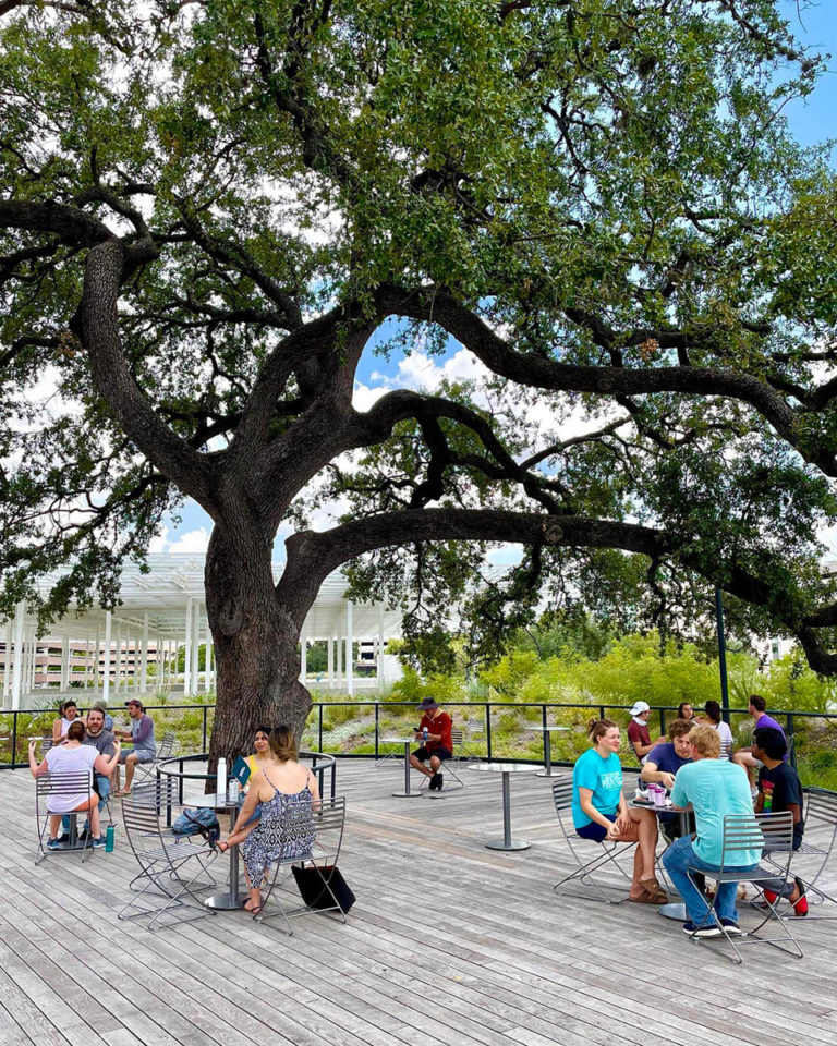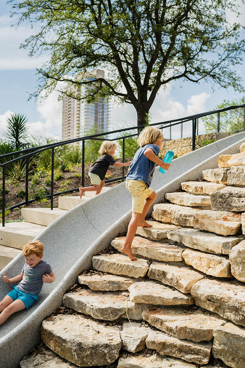 在这些壮丽的树荫下,定制的游乐景观激发了 Kitty King Powell Lawn 的想象力。悬臂式半圆形草坪盘旋在小溪上,构成精心雕刻的绿色空间的一部分,面向穆迪圆形剧场,这是一个由 Thomas Pfifer and Partners 设计的令人惊叹的艺术露天活动展馆,已经举办过大型音乐会和广泛的公众活动自开业以来的活动。The Love, Tito's Lawn 是孩子们嬉戏玩耍、野餐、公园瑜伽、艺术装置或音乐会期间的理想场所,可供 5,000 人坐在星空下欣赏这个世界级音乐场所的奇观.