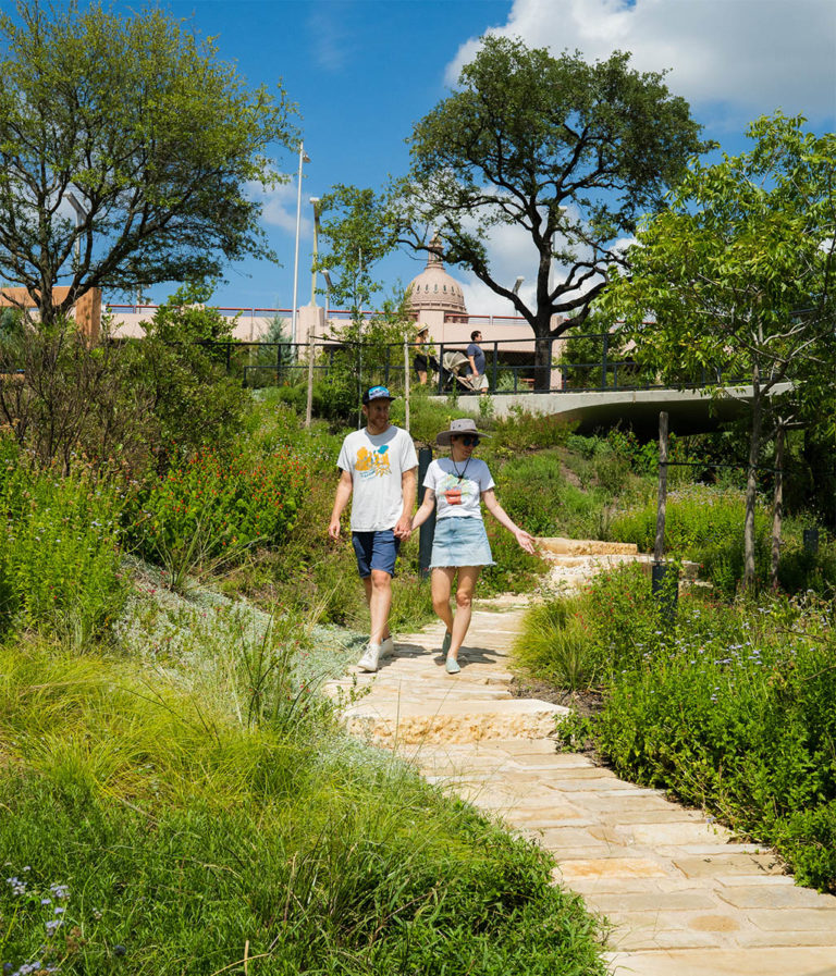 公园从公园内的建筑物中收集和处理所有水,并结合使用城市的再生水服务,以高度可持续的方式浇灌植被。整个公园的生物洼地、雨水花园和湿地梯田旨在揭示绿色基础设施的重要性和美丽,同时让游客沉浸在沃勒溪栖息地的原生动植物中。高架的 Suzanne Deal Booth Skywalk 穿过休息区、石灰岩圆形剧场 Lebermann Plaza 以及 Luci 和 Ian 的家庭山碧桂园内的一系列滚动花园,确保普遍可达性并在整个公园内导航超过 40 英尺的坡度变化. Hill Country Garden 拥有超过 90,000 种本土植物和 500 多种新树和野花,回顾德克萨斯州中部的希尔乡村景观。八棵重要的树木被移植到公园中,包括重达 300 多吨的巨大 44 英寸卡尺活橡树,并从国会大厦搬迁了七个街区到公园。