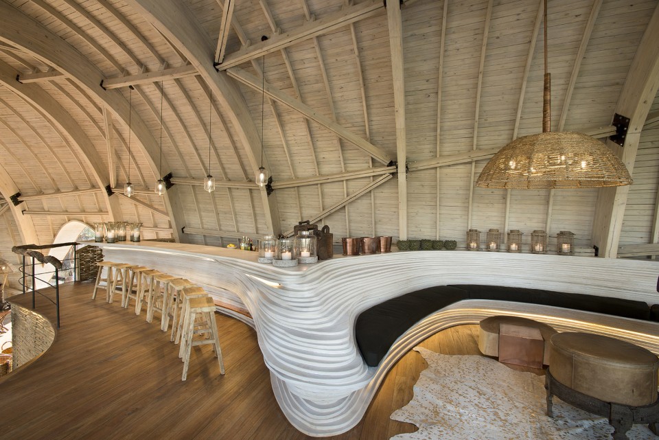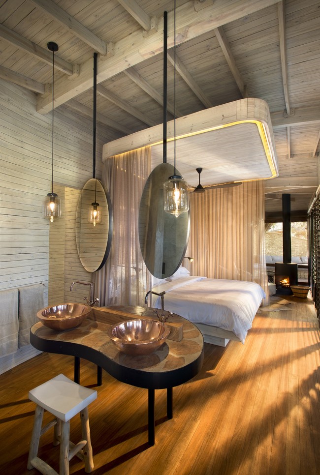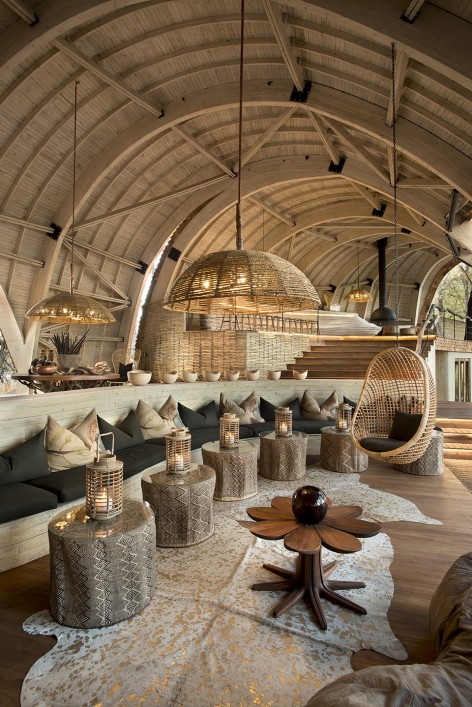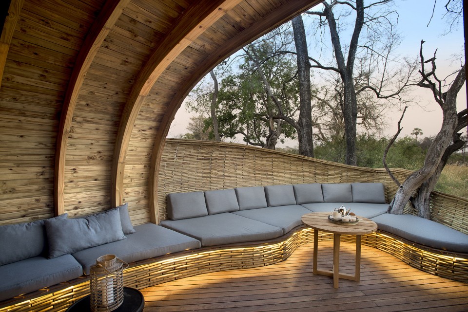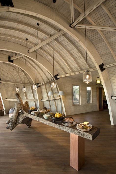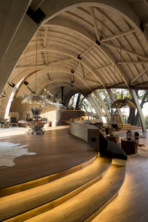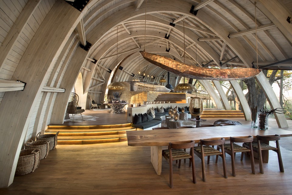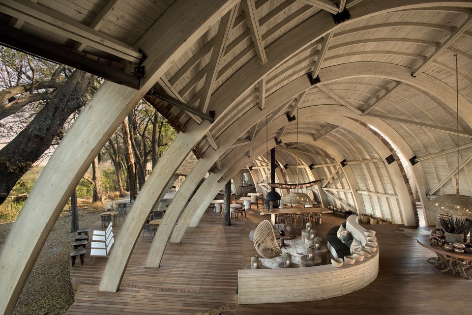 MB的设计重点在于创造一个更轻盈,同时也拥有更为环保的碳足迹的建筑。他们采用源自当地的自然材料,地面之上不见混凝土丝毫的踪迹,而酒店所消耗的所有电力都来自不远处的太阳能农场。而MB设计中对于空气、光线、空间与宁静氛围营造得重视则让Sandibe摆脱了常见于传统游猎营地酒店中昏暗的室内空间,干净、奢华而又如同雕塑般优雅。12座套房悬浮于沼泽地之上,而公共空间处一道道木梁在空中划出优美的曲线,引领人们来到坐拥美景的酒吧。