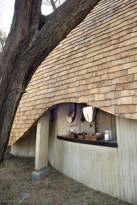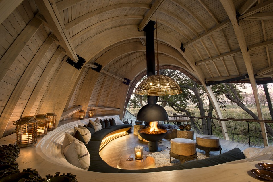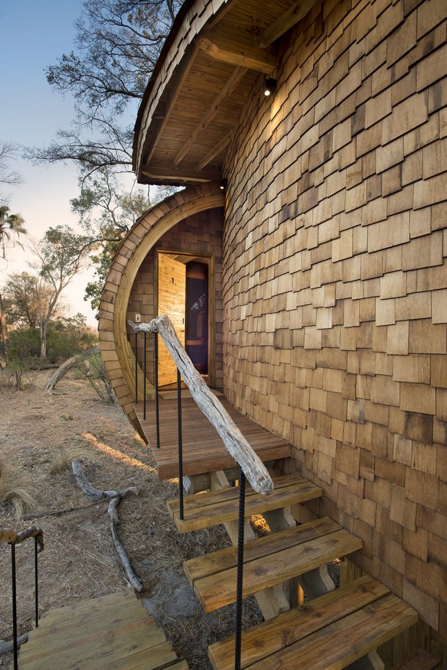 野生的棕榈与无花果树枝繁叶茂,形成了延绵的林冠。而林荫之下,远处三角洲的粼粼波光一览无遗。12座私人的木屋套房沿着沼泽的边缘,向公共空间的两侧延伸。每个小屋中,卧室与休息区的开放式设计让客人们足不出户,便能欣赏非洲美丽壮阔的原野景色。木结构的外侧覆盖着层层叠叠的木瓦,如同穿山甲又或是鸟巢一般,完全融入了环境之中。