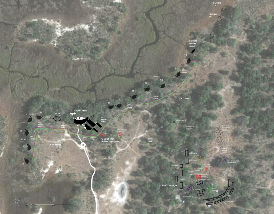 前来此处的客人们将会在距离酒店不远,但丝毫看不见酒店踪迹的地点统一下车。然后在员工的带领下穿过丛林,到达入口,方能一睹点缀在林间的木屋的风采。拾阶而上,客人们穿过层层叠叠木瓦搭建而成的建筑立面步入大厅,来到悬空约1.5米的用餐平台。向左前行,高台上一道道木梁在空中划出优美的曲线,引领人们来到坐拥美景的酒吧和休息室。顺着木栈道继续前行,人们来到古老的无花果树下的观景平台,静看远方三角洲处的粼粼水光。而在外侧的树林下,巨大的木头堆叠出一个将在夜晚燃起篝火的火炉。