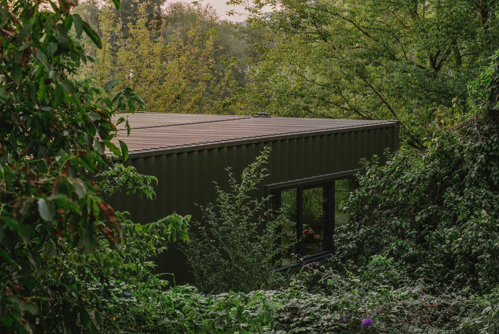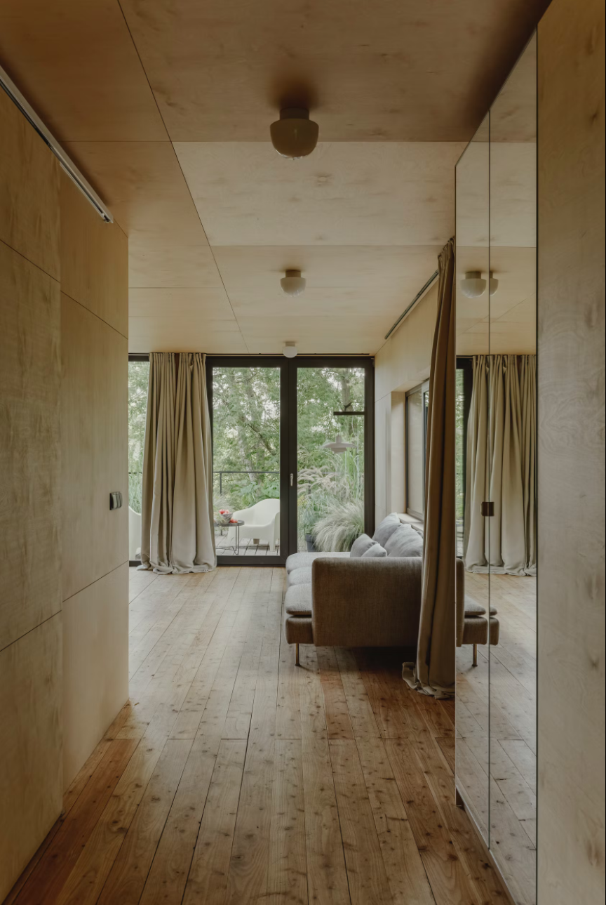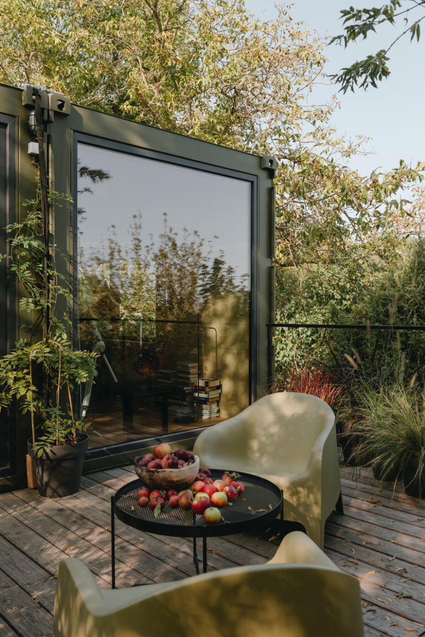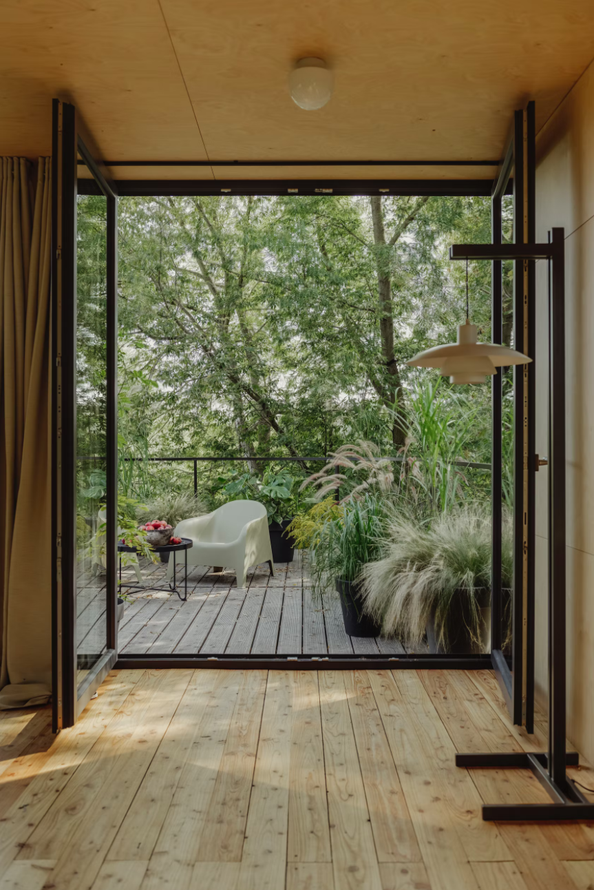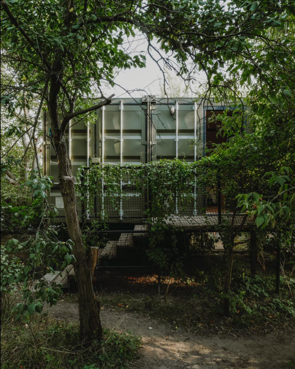 客舱由两个货运集装箱组成,12 x 2.5 m 和 2.9 m 高。通过安排内部功能,包括带厨房的客厅、工作场所、卧室和带浴缸的浴室,总共可以获得 54 平方米的可用空间和 24 平方米的露台绿地空间。便携式小屋的墙壁采用喷涂泡沫隔热,并采用桦木胶合板完成,营造出独特的内部氛围。特意留下了由厚梯形钣金制成的特色立面,以显示原始建筑材料的诚意。墙壁被漆成暗绿色,将物体与周围环境融为一体。在俯瞰河流的起居区,在金属门所在的地方安装了大阳台窗户。在侧立面上,窗户被放置在墙壁高度的中间,以尽可能多地留出内部布置选择。它们是在风格上完美契合简单形状的正方形,并根据其功能组合成双重和三重配置。该设施由设计的外部钢楼梯和露台上的特色拱形栏杆相辅相成。