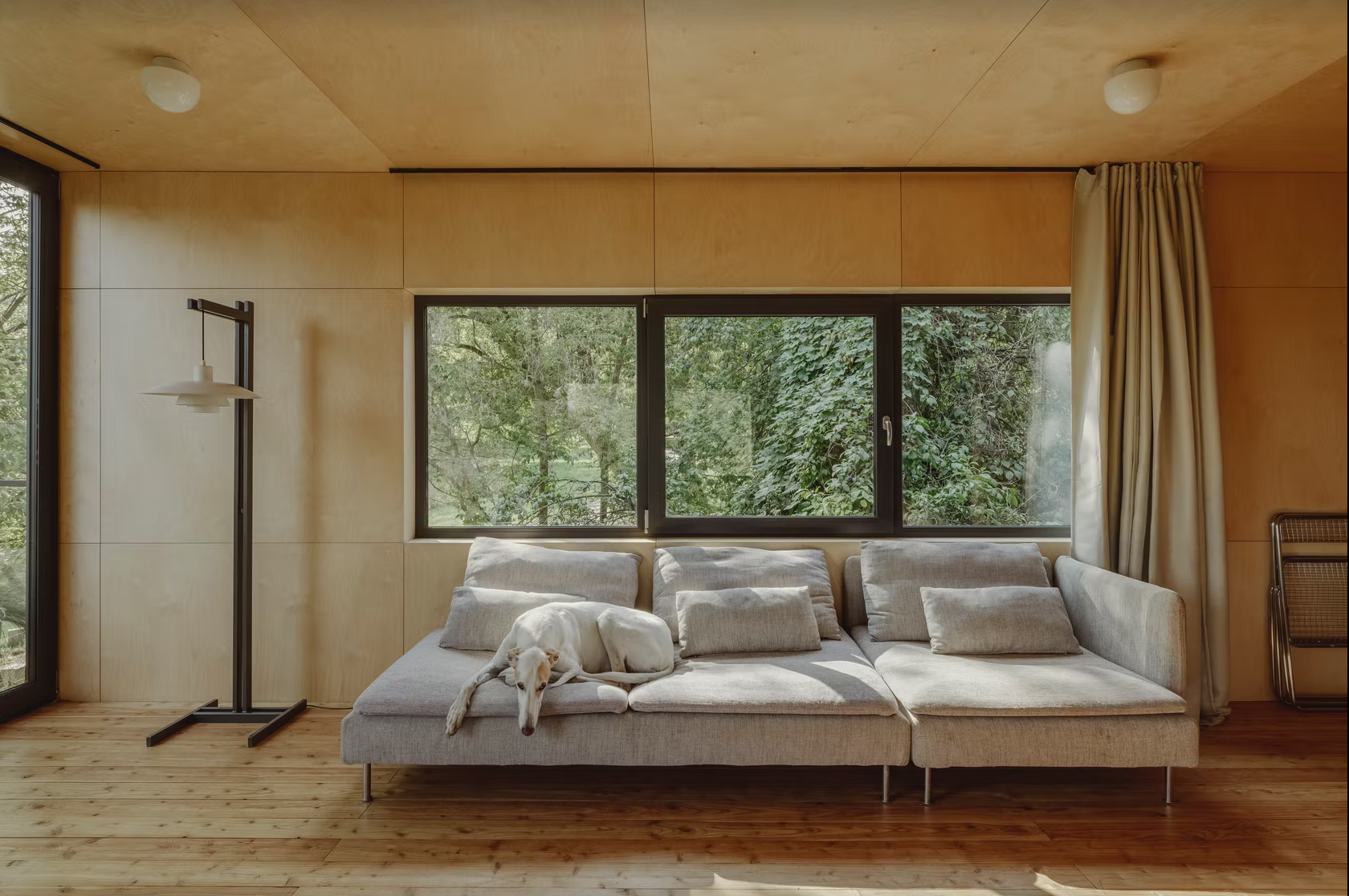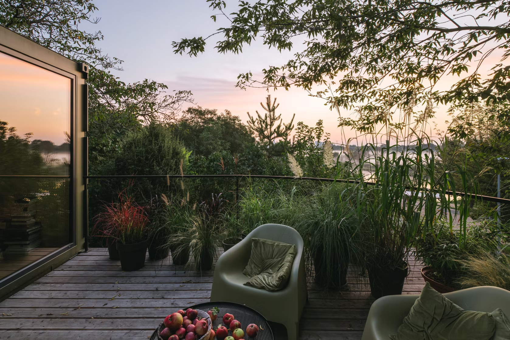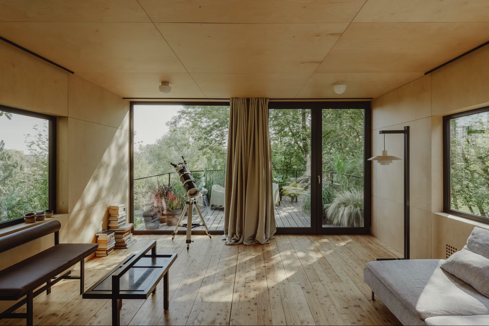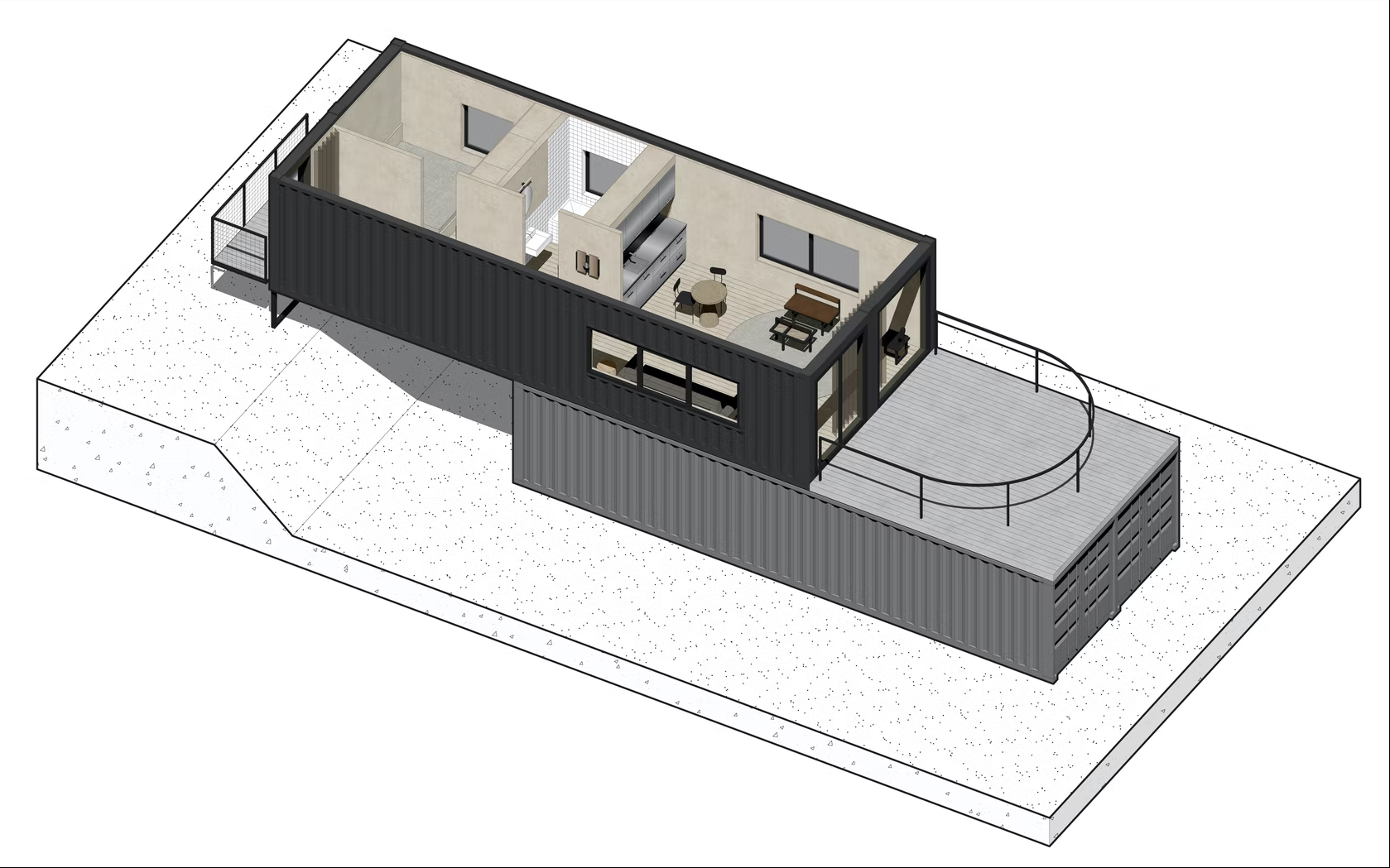 客舱由两个货运集装箱组成,12 x 2.5 m 和 2.9 m 高。通过安排内部功能,包括带厨房的客厅、工作场所、卧室和带浴缸的浴室,总共可以获得 54 平方米的可用空间和 24 平方米的露台绿地空间。便携式小屋的墙壁采用喷涂泡沫隔热,并采用桦木胶合板完成,营造出独特的内部氛围。特意留下了由厚梯形钣金制成的特色立面,以显示原始建筑材料的诚意。墙壁被漆成暗绿色,将物体与周围环境融为一体。在俯瞰河流的起居区,在金属门所在的地方安装了大阳台窗户。在侧立面上,窗户被放置在墙壁高度的中间,以尽可能多地留出内部布置选择。它们是在风格上完美契合简单形状的正方形,并根据其功能组合成双重和三重配置。该设施由设计的外部钢楼梯和露台上的特色拱形栏杆相辅相成。