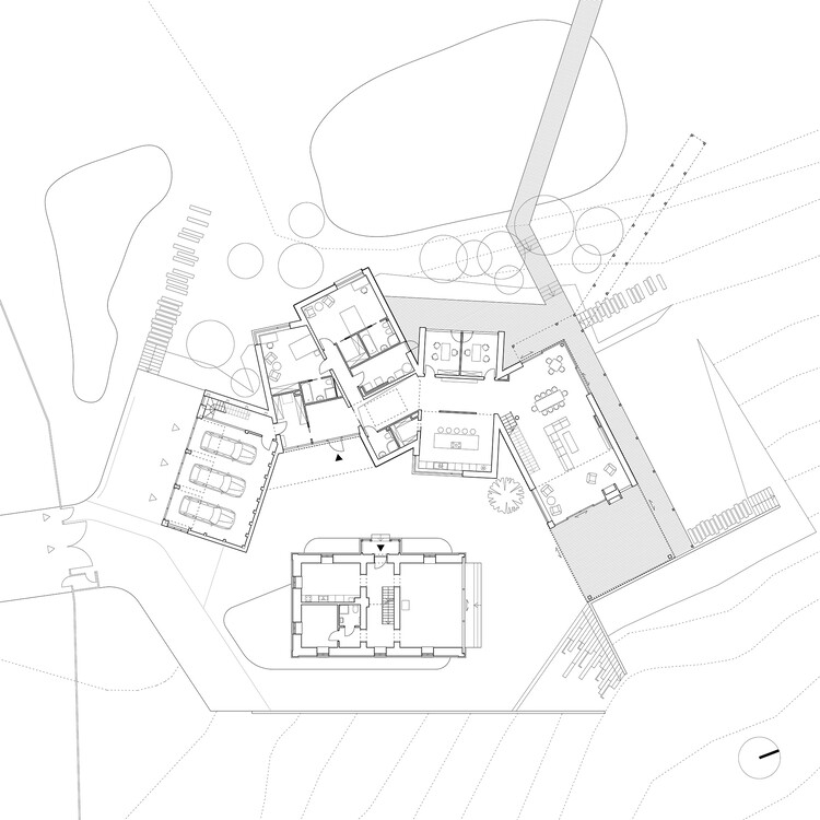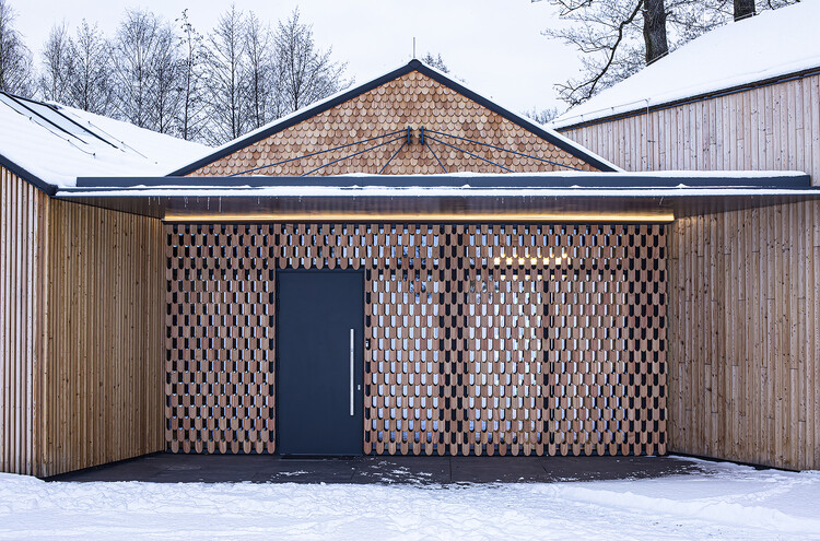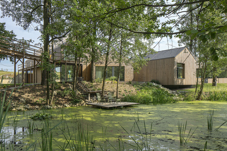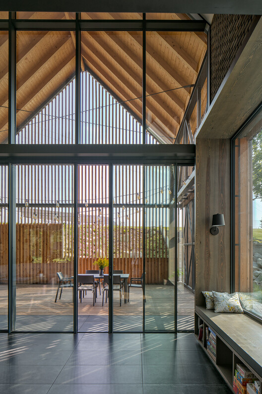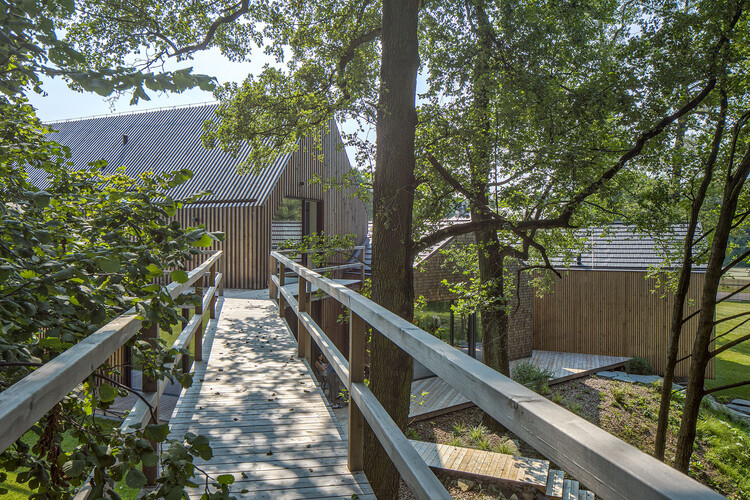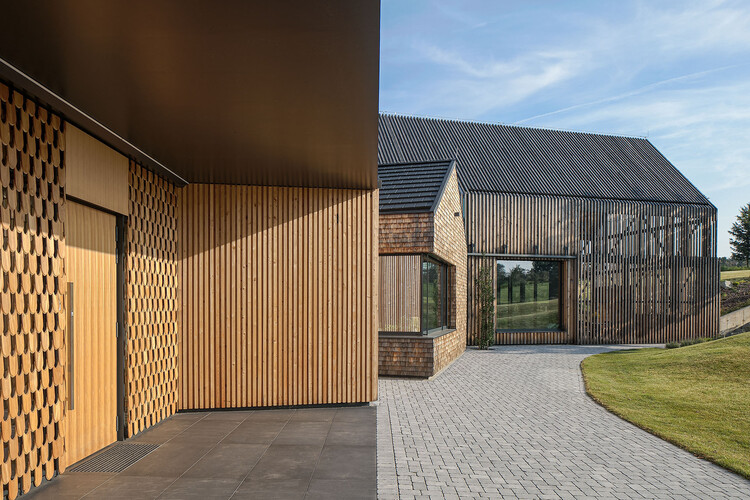 在创建农舍的单个谷仓时,我们以和谐的自然方法为指导,主要是光与影,地形,现有绿地和基础设施的游戏。大型阳光明媚的玻璃窗被镂空立面,露台屋顶或茂密的绿色植物遮蔽。因此,房屋在夏季不会暴露在过度的阳光下。在可持续发展原则的指导下,我们确保保护宝贵的树架。为了更好地将建筑与极其有价值和美丽的景观融为一体,我们在一楼设计了一座人行天桥,在一楼设计了一个平台,然后根据该地区的地形进行调整。