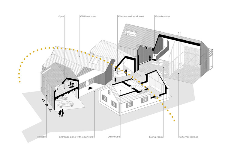 未来发展的下一阶段将包括对将要拆除的老房子进行创造性的重建。我们提议恢复其原始的,美丽的比例,受到晚年扩展的干扰。我们用新的屋顶增强了入口,与历史立面的原始木制装饰相连。在房子里,我们揭开了原始建筑材料 - 红砖 - 以发挥其自然美。重建的瓷砖加热炉陈列在由木制屋顶覆盖的主两层空间中。这所房子与其他房子的区别在于缺乏传统意义上的第四立面。全玻璃墙允许房屋的结构暴露在外部和新房子的壁炉露台上。老房子周围环绕着五颜六色的植物和鲜花,这是这种乡村历史建筑的特征。
