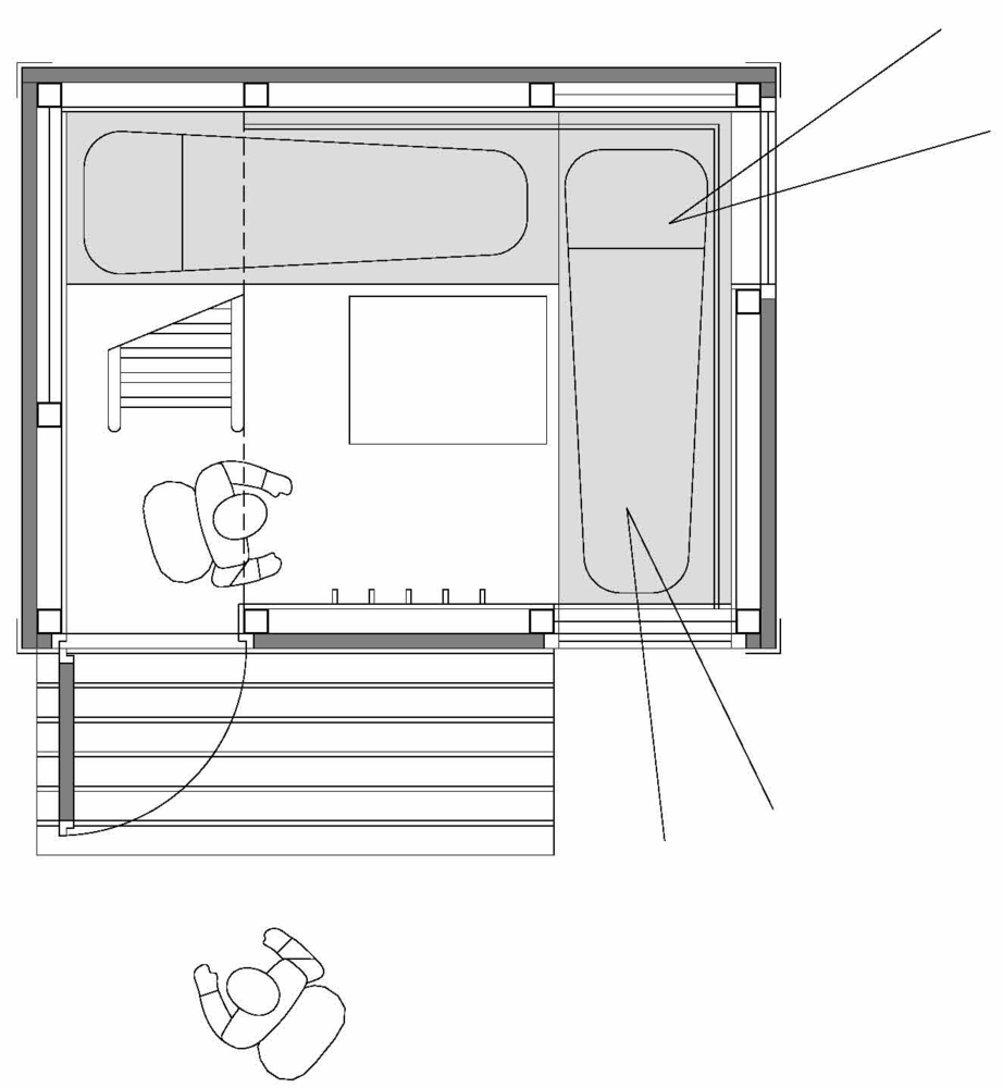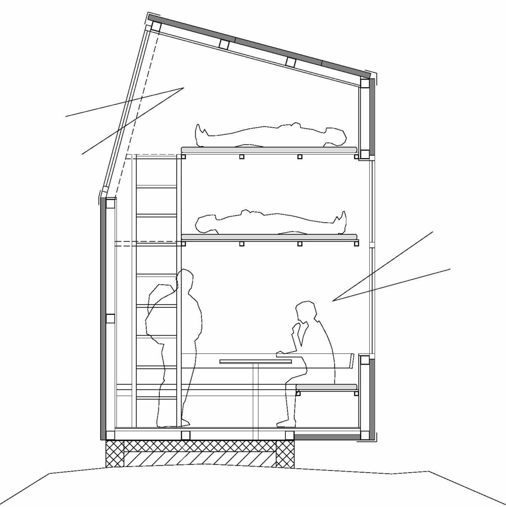 建筑整体由多层空间组成。建筑分三层,通过一个梯子组织交通,人们利用它上下楼层。一楼有长凳和小桌子,白天作为用餐和生活空间,晚上作为休息区。上面两层为额外的床铺层或生活层。