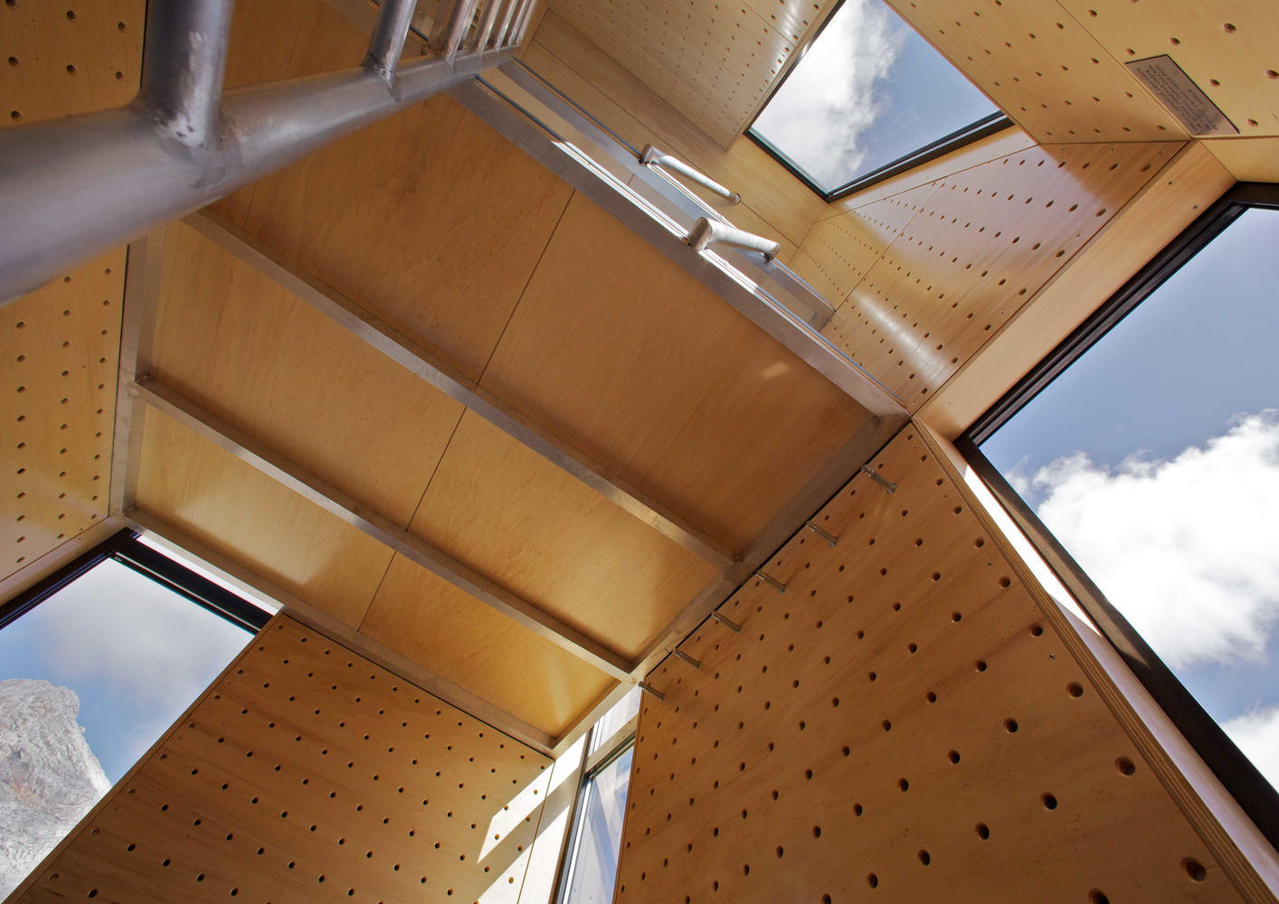 宿营地没有供暖设备。建筑外表皮由铝隔板组成,最大限度阻止建筑热量的散失。内部采用木制穿孔板,具有除湿作用,因此室内环境能够保持温暖干燥。通常情况下,上层比下层会暖和些。
