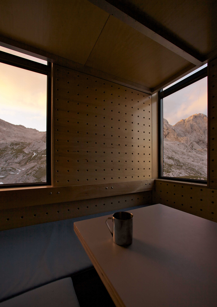 宿营地占地面积很小,建筑尺寸是2×3米,高4.5米。窗户开设在建筑一角,为人们提供最佳的观景角度,由此使得室内非常明亮。这样的开窗方式使得床位仿佛漂浮在山中。