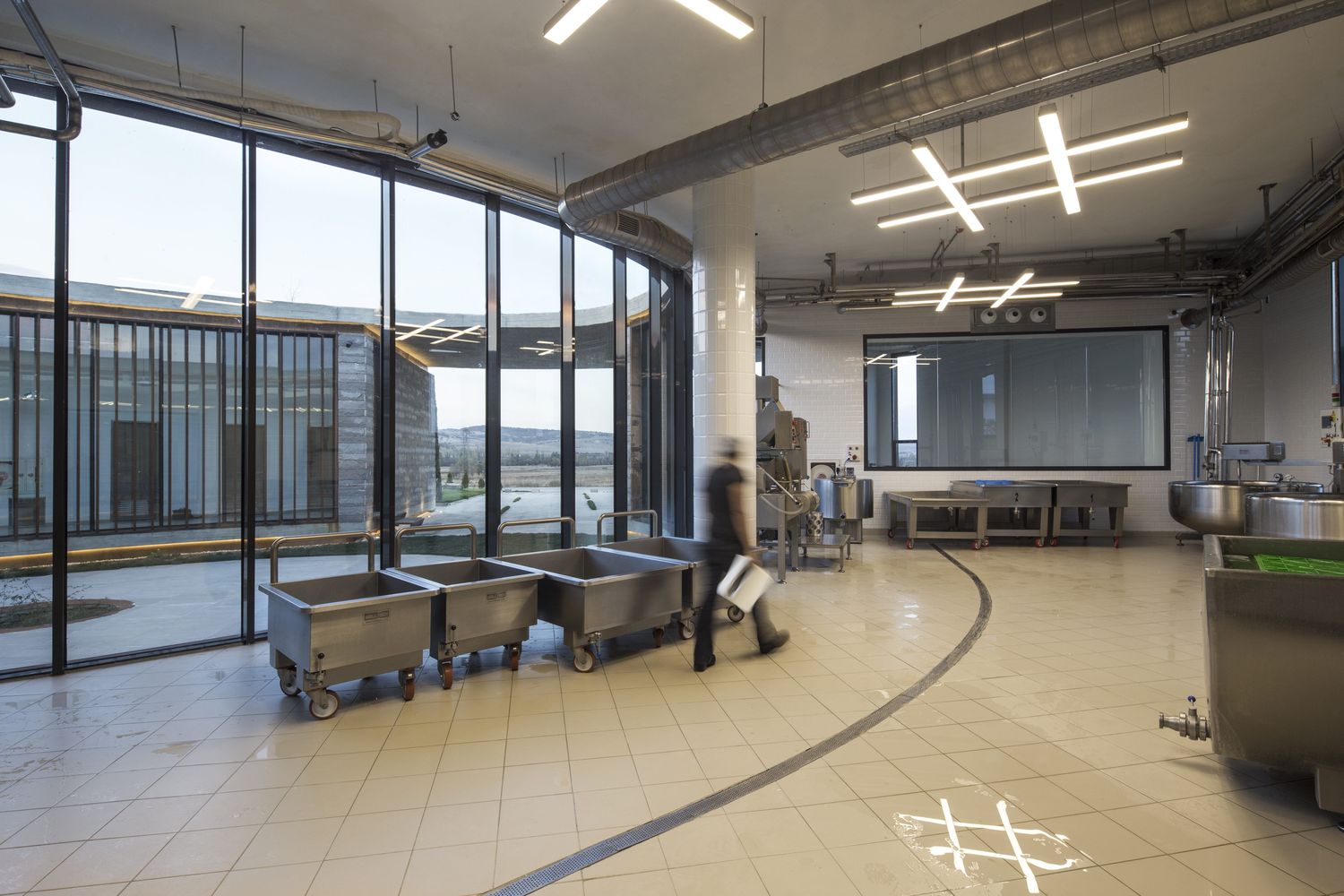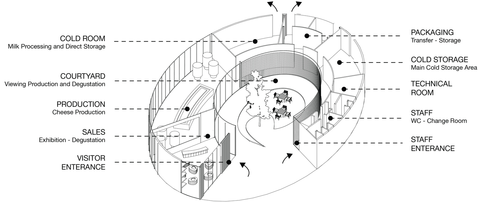 奶制品厂通过使用天然材料和自然色调与周围环境相协调。通过将绿色环境和景观朝向内部庭院,该建筑提供了一个舒适的内部环境,使游客和工作人员可以在其中自由活动。