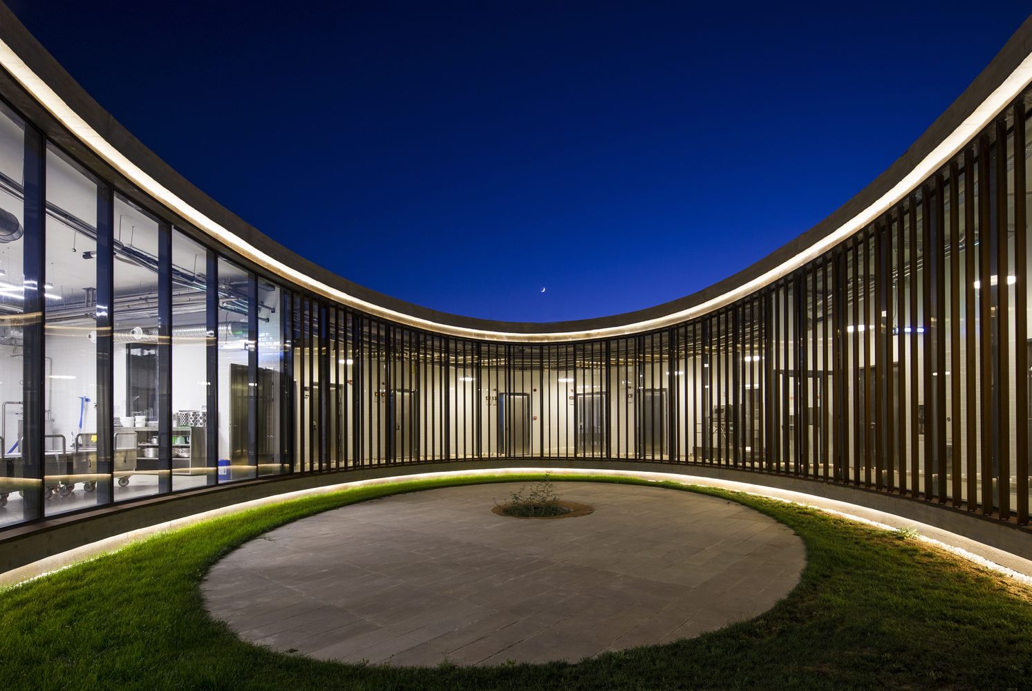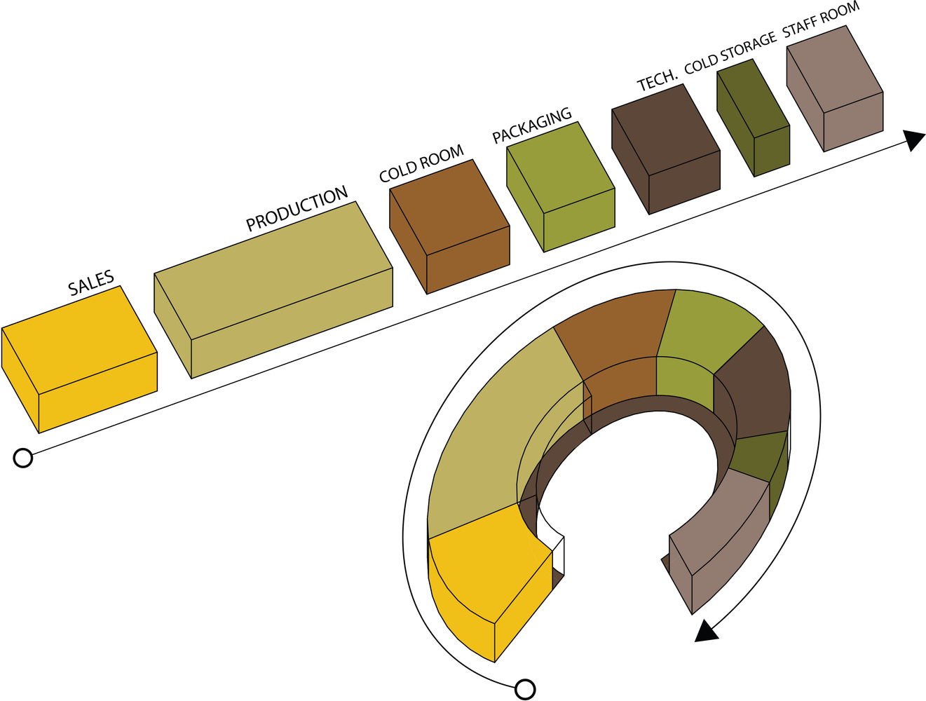 建筑将线性生产过程和空间包围在一个形成内部庭院的椭圆中。站在这个庭院中间,游客可以360度观赏到生产全过程。透明的立面使我们可以窥视到生产空间,而在内部的工作人员则激活了整个过程。