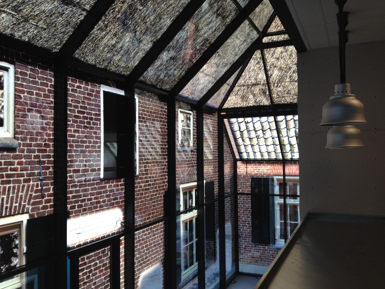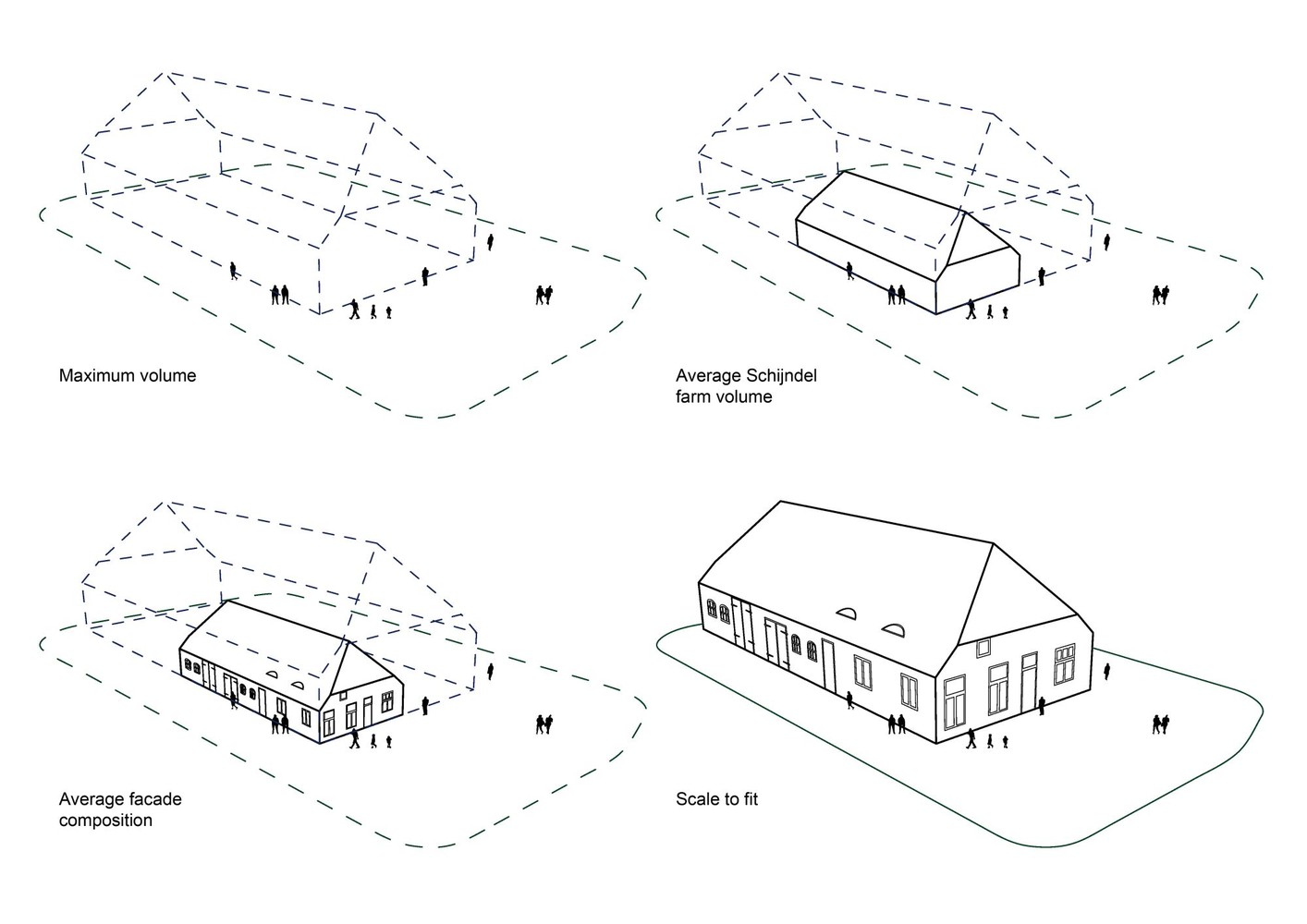 巧合的是,由城市规划师所定义的最大围护体系是一个传统Schijndel农场的形式。遗存的本地古农场都进行了测量与分析,一个理想的平均值就从这些数据中诞生了。与MVRDV的合作的艺术家Frank van der Salm为所有遗存的传统农场拍了照片,并从这些摄影中得到了一个典型农场的构成。这些图像通过烧结玻璃流程打印到1800平方米的玻璃幕墙上,从而获得了如同教堂的彩色玻璃窗效果。根据光线和视野的需要,打印或多或少都是半透明的。