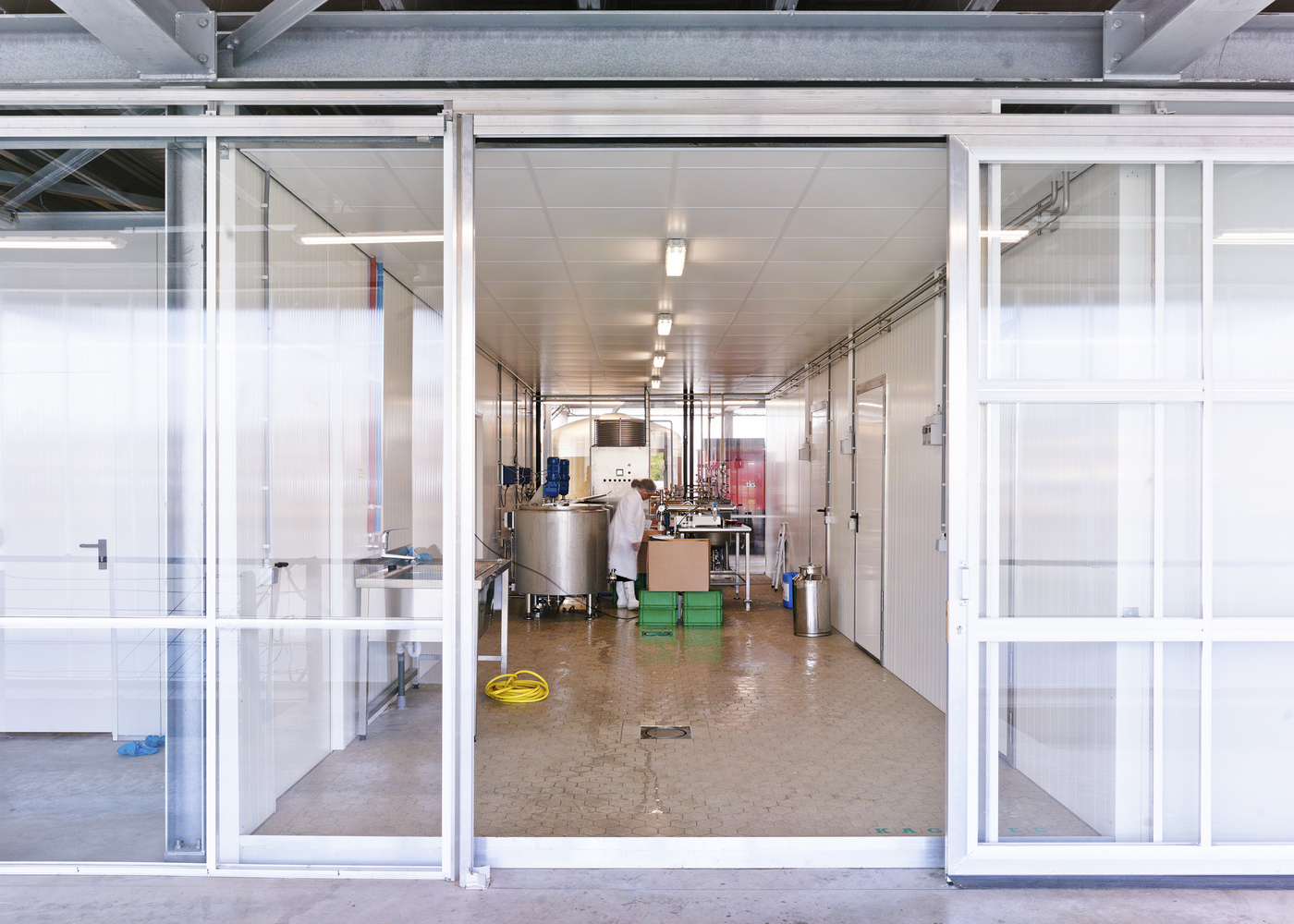 围绕着奶牛花园的两个走廊通过两座钢桥垂直连接,将各种唤起人们回忆的空间串在一起,形成了一条具有教育意义的路线。沿着这条路线,游客可以在不干扰生产流程的情况下了解农场的所有活动。奶牛花园周围的饲养围栏和乳制品加工设备周围的玻璃墙有助于游览者感官体验的提升,突出了公司的透明化生产的特点。饲养,乳制品和粪便处理都组成了一个紧凑高效的系统,使这个独特的多层计划成为可能。