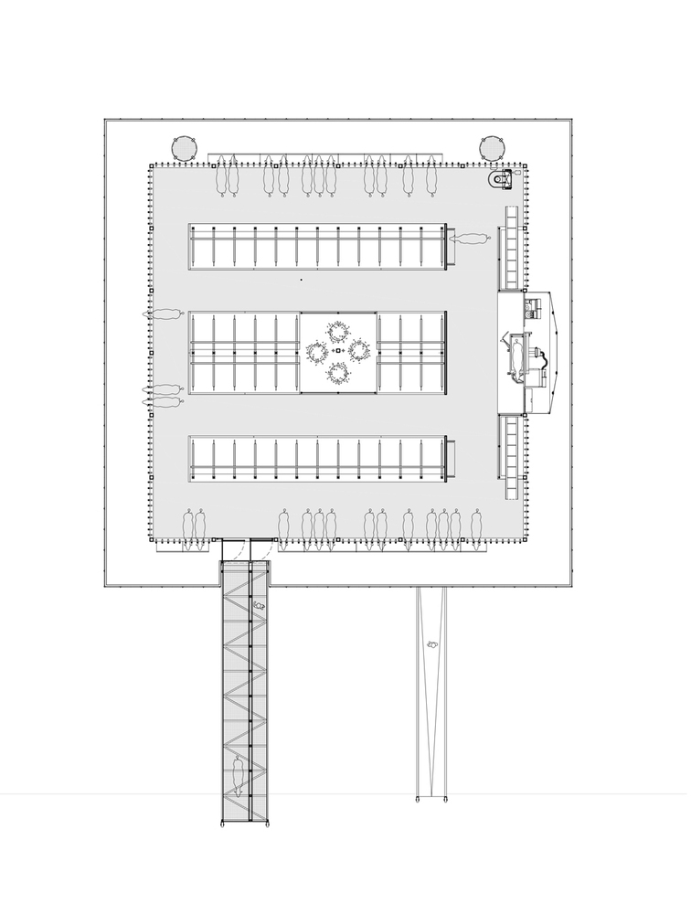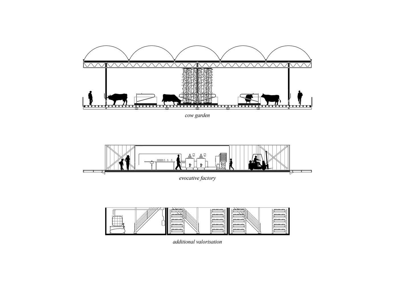 漂浮农场是一个紧凑的、有逻辑的堆叠结构,它将技术设施、存储、加工和生产融合在一个单一的实体中。三个相连的混凝土浮箱容纳了水果(酸奶的原料)的生产、雨水和废水的回收以及其他设施。工厂上层结合了牛奶和酸奶加工,饲养系统,粪便处理和零售。奶牛花园将容纳40头奶牛,这些奶牛将由粪便清理机器人、挤奶机器人和与动物福利相关的各种设备照料,比如放置在中央的用以保冷的“绿色柱子”。悬挑的地板和屋顶构建出多层的农业中心,并连接组合了其建筑。