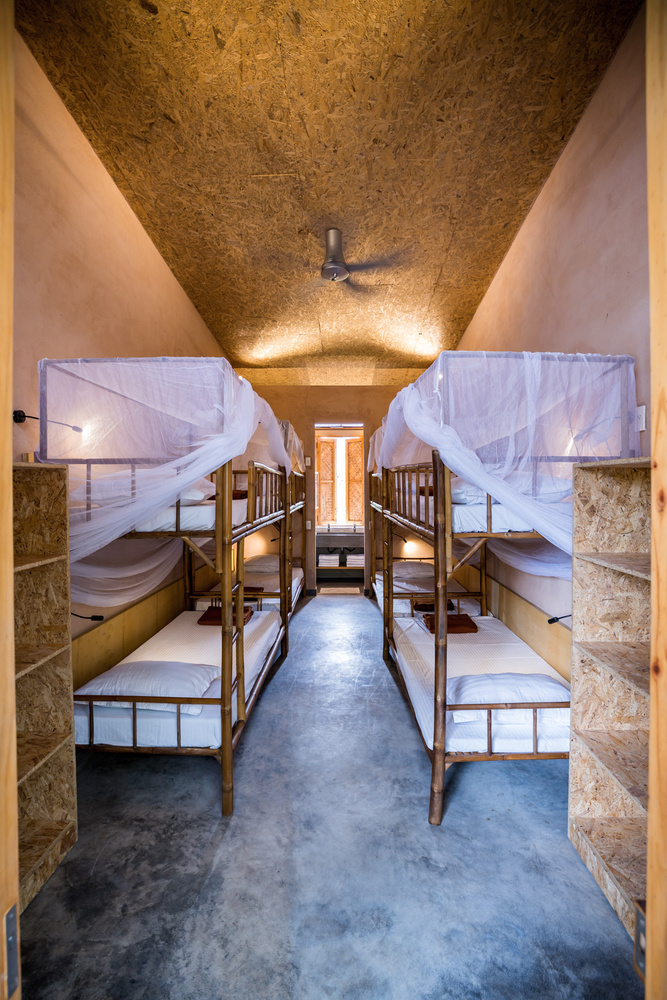 采用当地现有材料可以有效的节约成本,建筑采用简单的钢结构,在基地附近预制而成,墙壁由当地砖砌成,覆盖天然石灰泥和当地红砂。屋顶材料由当地稻壳与硅藻土混合而成,具有防虫害的作用,稻壳富含硅酸盐,具有良好的防潮性能,而且其成本低廉,可以生物降解。所有的门窗都采用了本地实木(平台使用炭化木),并结合了竹编,既经济又防水,还能保证良好的自然通风。