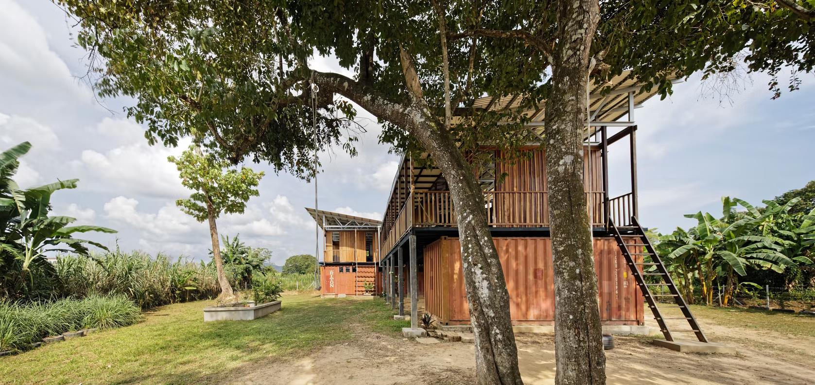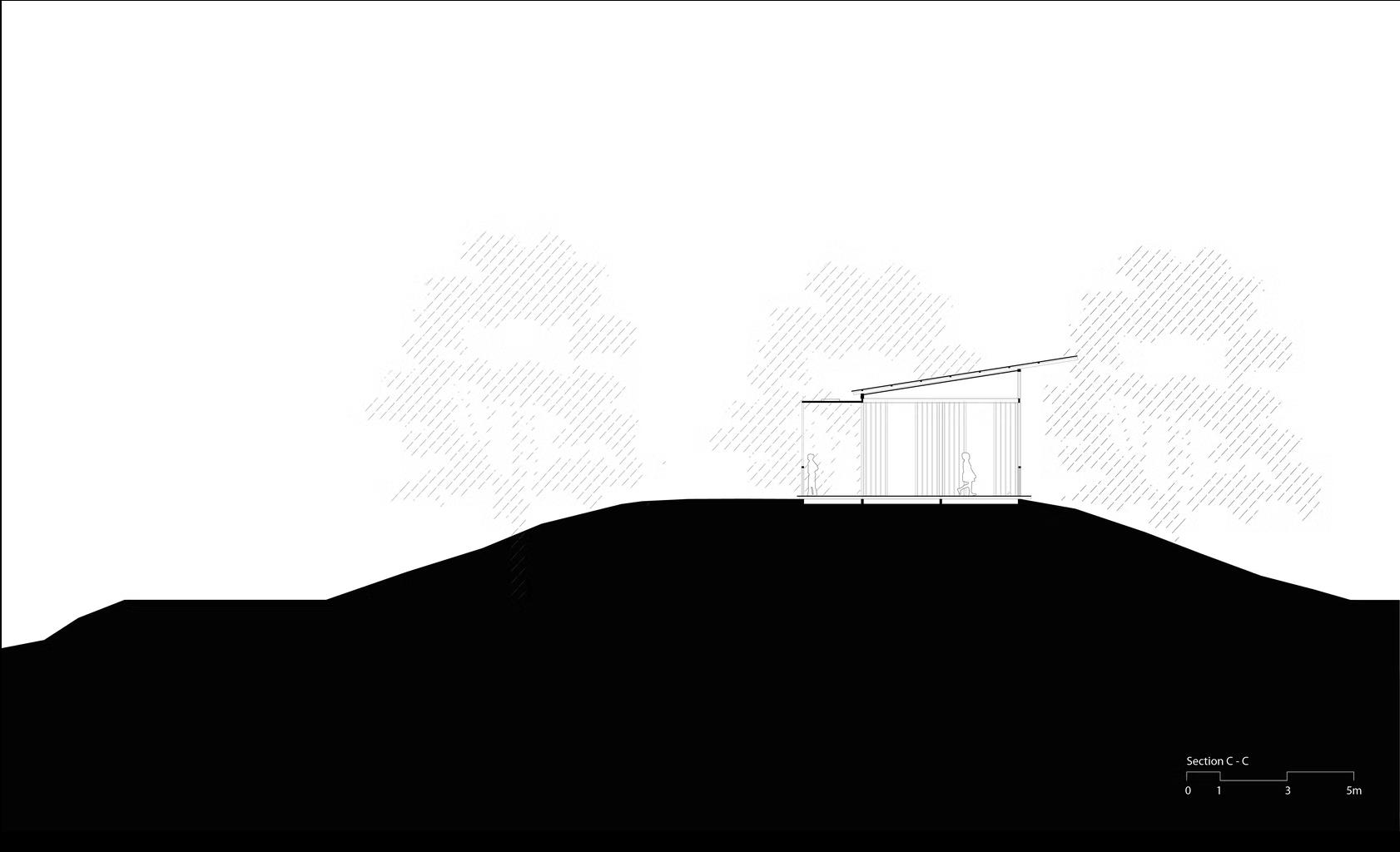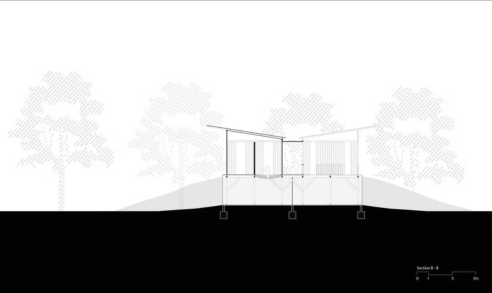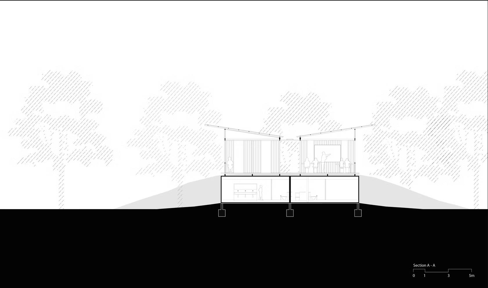 五个退役的集装箱和一个从为集水池挖掘的土壤中人工建造的土丘支撑着教室。这最大限度地减少了结构组件,并稳定了框架。此外,它还在教室下方创造了一个有盖的空间,作为午餐区和聚会空间。集装箱本身用于存储和厕所。