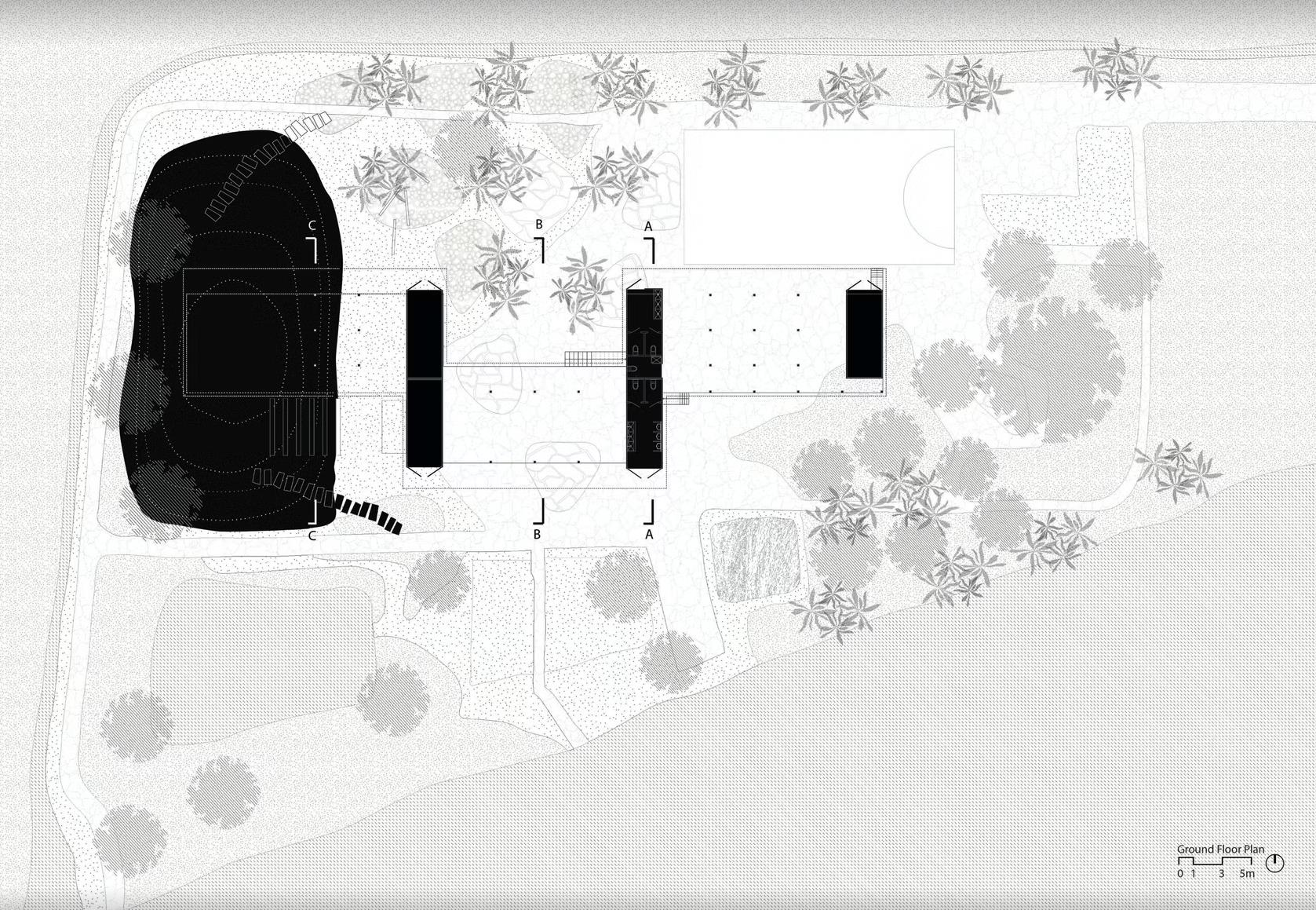 在一楼,三个街区交替放置在中央阳台的两侧。两个街区包含四个教室,土墩上的第三个街区包含教师室和图书馆。它们沿着东西方向定向,以尽量减少热量增加,避免阳光直射到长高的地方。这也意味着教室都面向河流,并享受自然的空气流,沿南北方向流过房间。