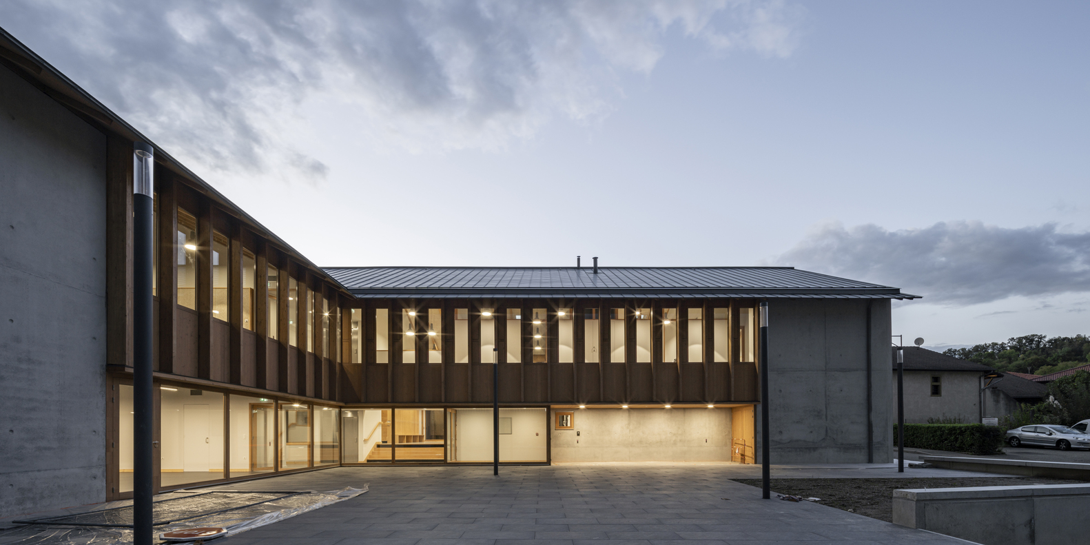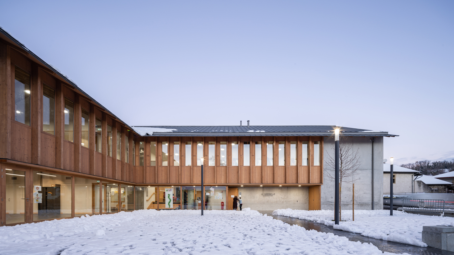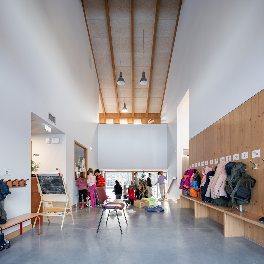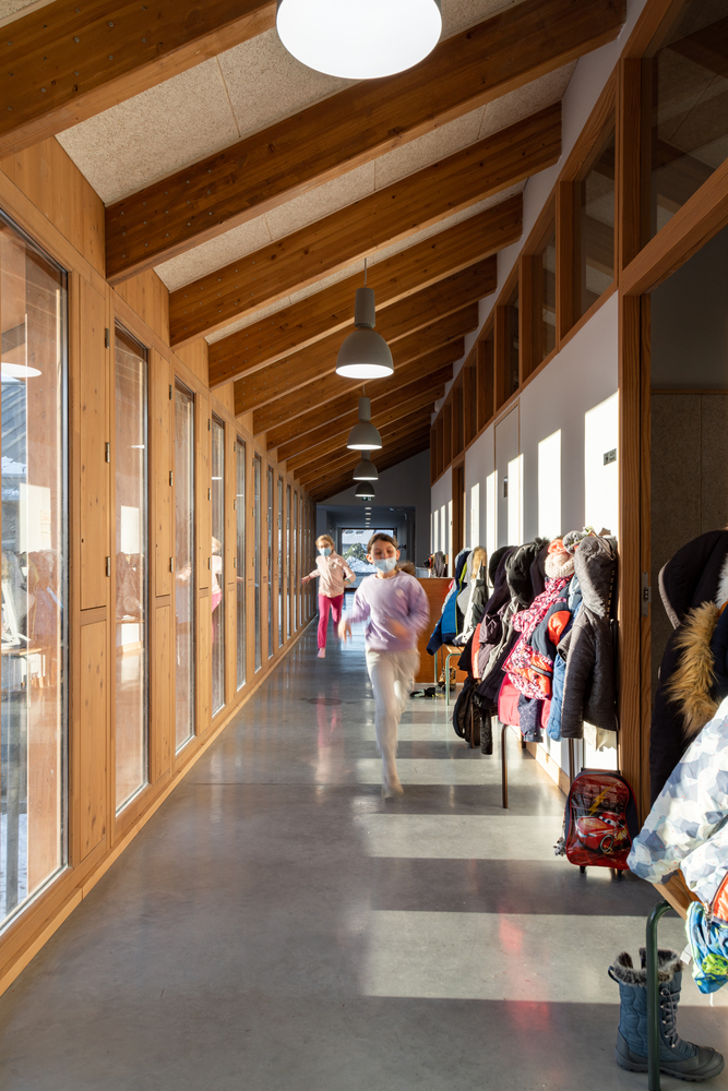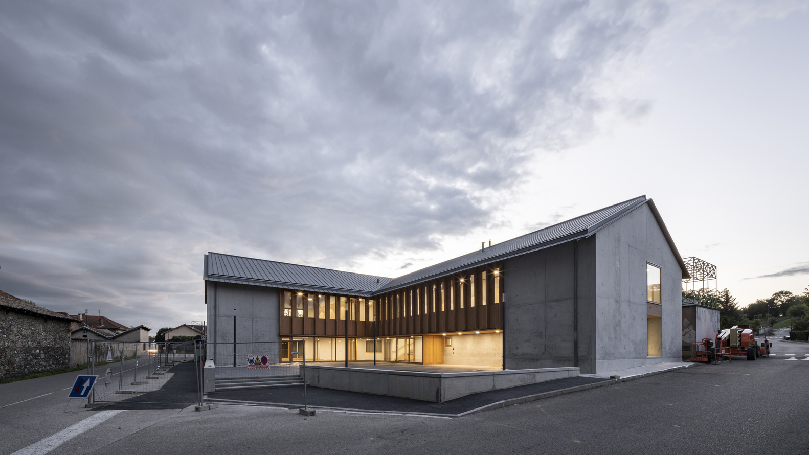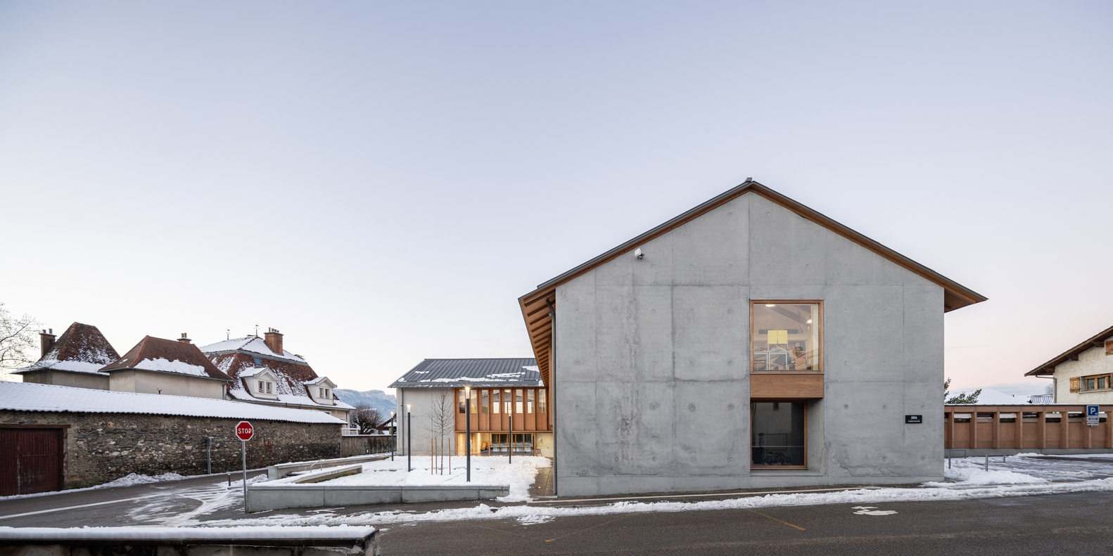 在“L”形布局的基础上,立即建造了与街道相连的广场,以及一个保留下来的儿童花园。与街道对齐的两个山墙立面显示出强烈的矿物气息。在两者之间展开了一个开放透明的木结构,给人一种上升的印象,以加强村庄和建筑空间之间的连续性。这些基本的形式和建设性特征,在这里被锌屋顶覆盖,指的是伊泽尔的乡土建筑。