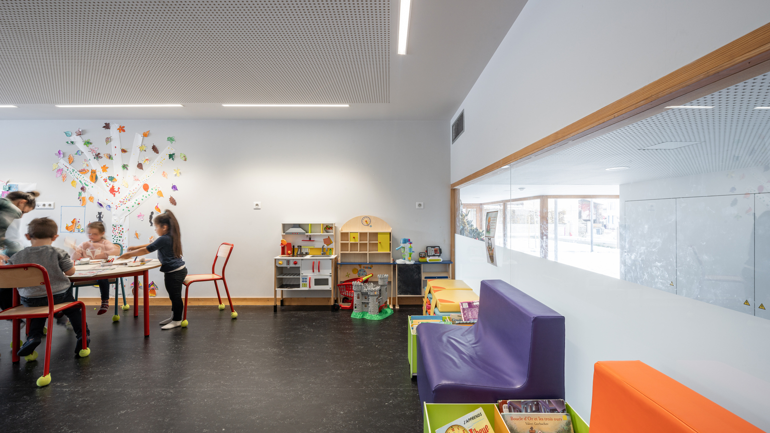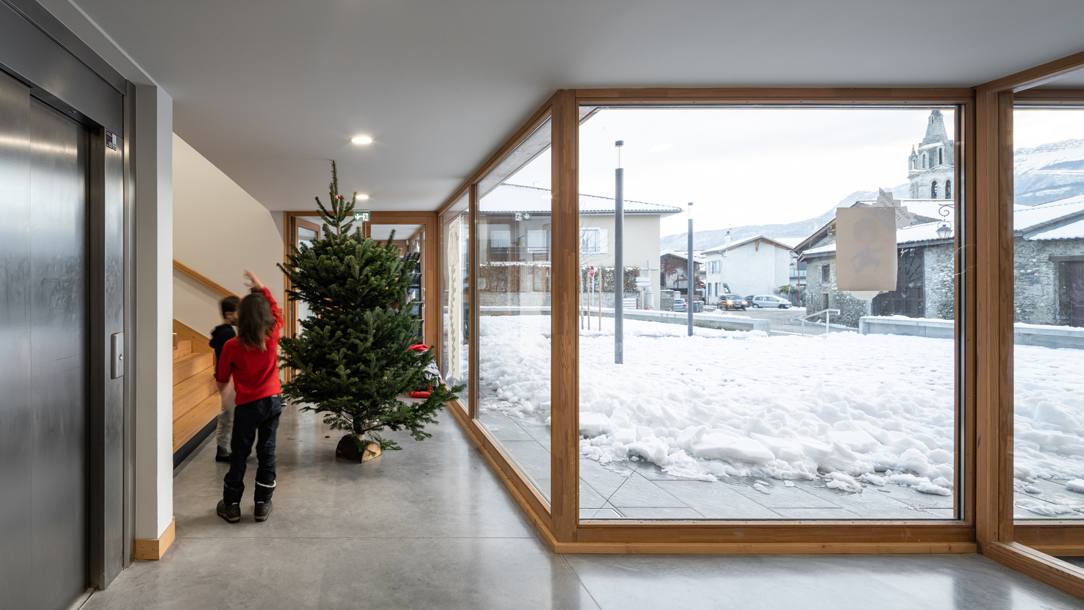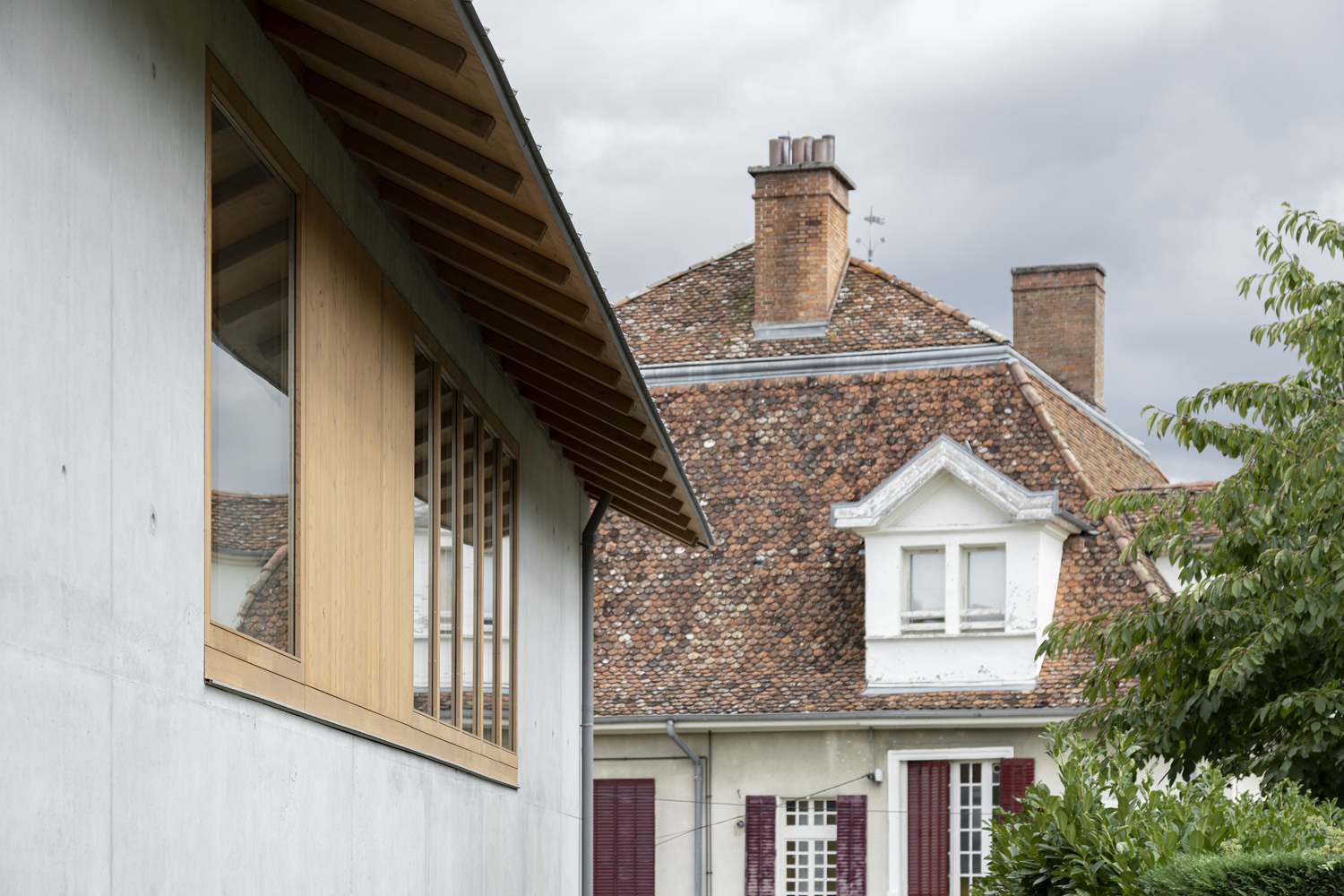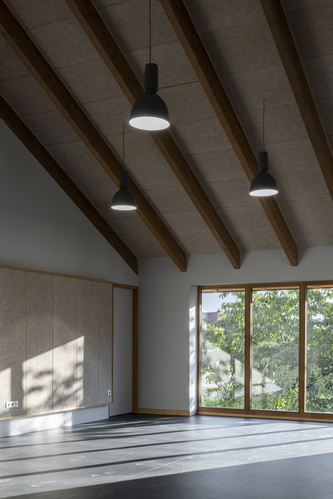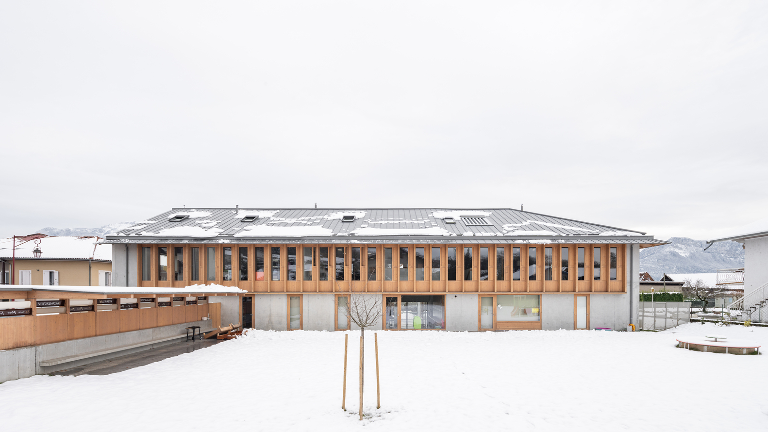 在“L”形布局的基础上,立即建造了与街道相连的广场,以及一个保留下来的儿童花园。与街道对齐的两个山墙立面显示出强烈的矿物气息。在两者之间展开了一个开放透明的木结构,给人一种上升的印象,以加强村庄和建筑空间之间的连续性。这些基本的形式和建设性特征,在这里被锌屋顶覆盖,指的是伊泽尔的乡土建筑。