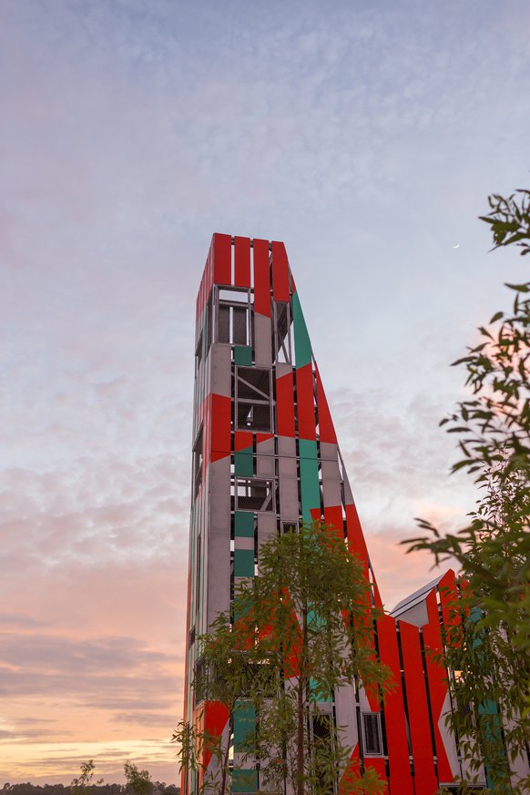 树屋让人想起蚂蚁农场、飞机机身和机尾、昆虫和工业结构。多层结构似乎是由四个高大的隧道滑梯和一个入口拍摄支撑的。在内部,楼层以意想不到的方式上升和下降,开口提供了楼层之间的通道,而尾部或头部允许上升到面向西的 12m 高的观察水平。
