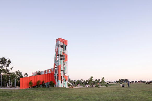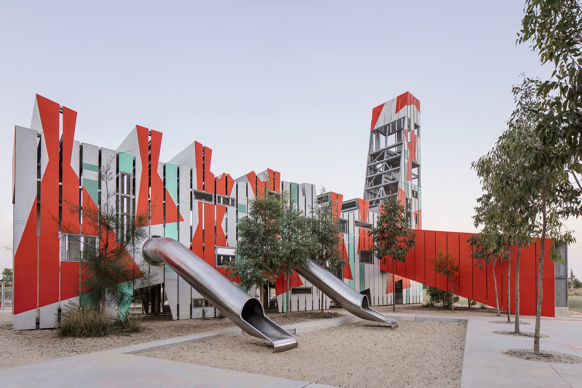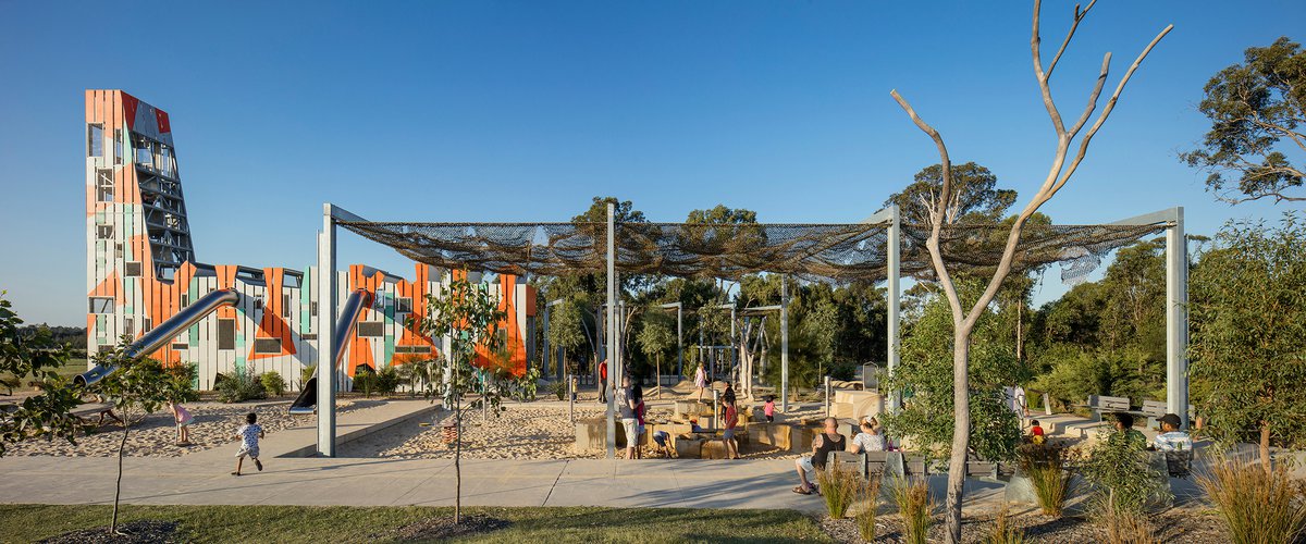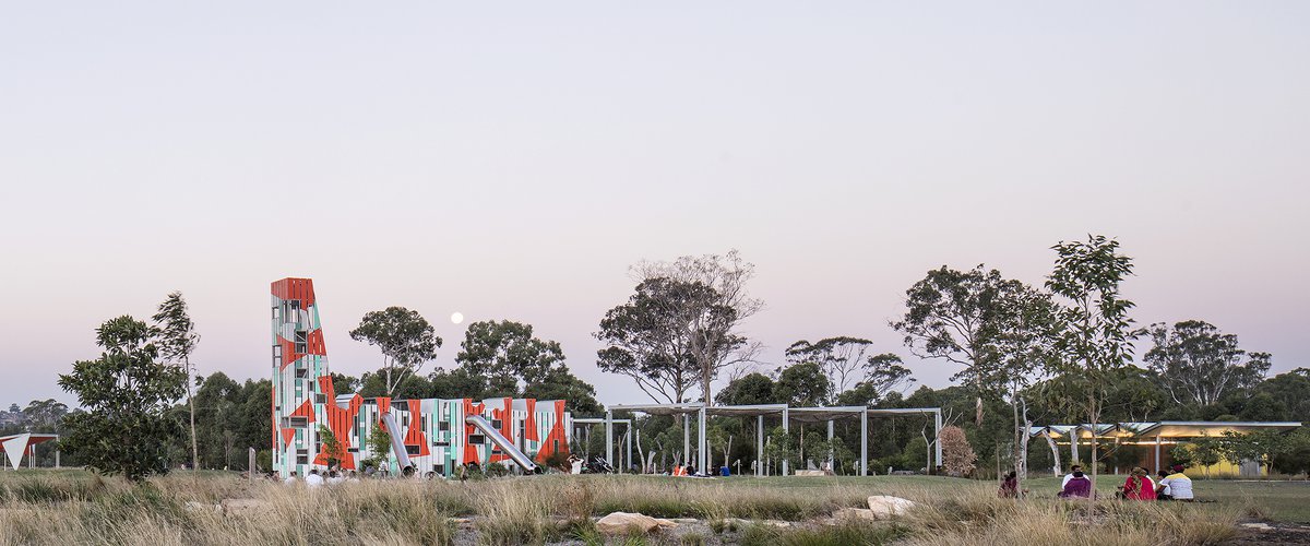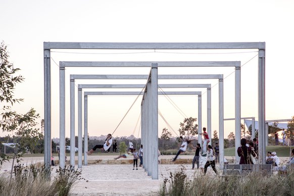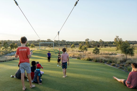 操场的最西端是一只50米的双飞狐,与大十字草坪的西臂接壤。它让骑手们奔向山顶和遥远的西部天空。靠近秋千的装置也将用户推向天空和向下倾斜小溪和蓝山远处轮廓的扩展景观。