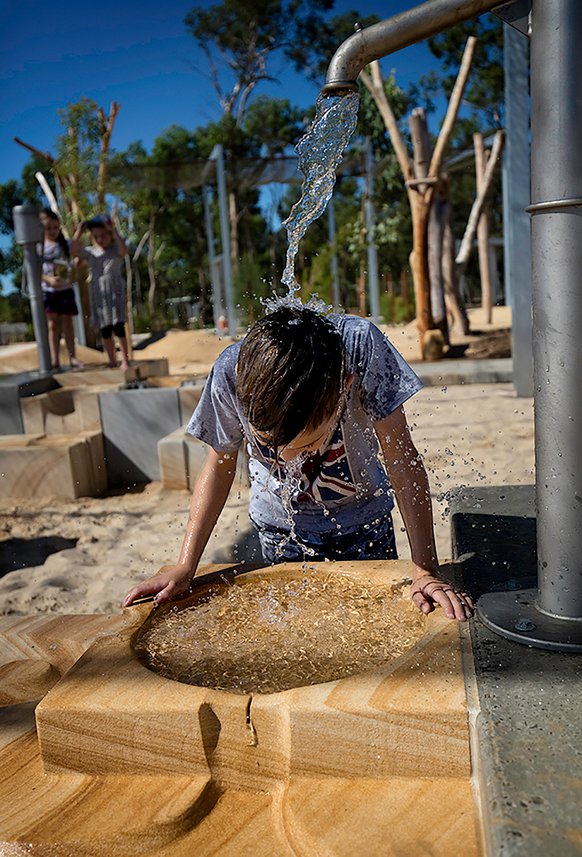 相邻的自然游乐区利用现有景观、保存完好的原木、巨石和小土丘创造了一个探索和玩耍的环境。水上游戏包括矩形砂岩块和水泵的布置。这些块已经被机器人雕刻成通道盆地、小溪和水滴,水流可以通过铰链门引导到这些通道中。该乐团坐在一个大沙坑中,为孩子们提供了进一步的手段来控制流过砂岩的水流。覆盖自然游戏的是由钢门架支撑的遮阳网,与秋千、飞狐和入口门的结构相呼应。