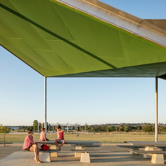 Redgum 跑道是一公里长的桉树网格,位于第二次世界大战紧急跑道的两侧。森林被间歇性清理,为聚会和非正式游戏创造空间。南部绿化带的作用是筛选西部大公路沿线的新旅游开发项目。两片森林在东边的杜恩赛德路入口处汇合,在西边展开,向天空和远处的蓝山敞开了视野。