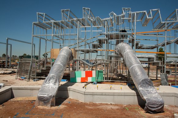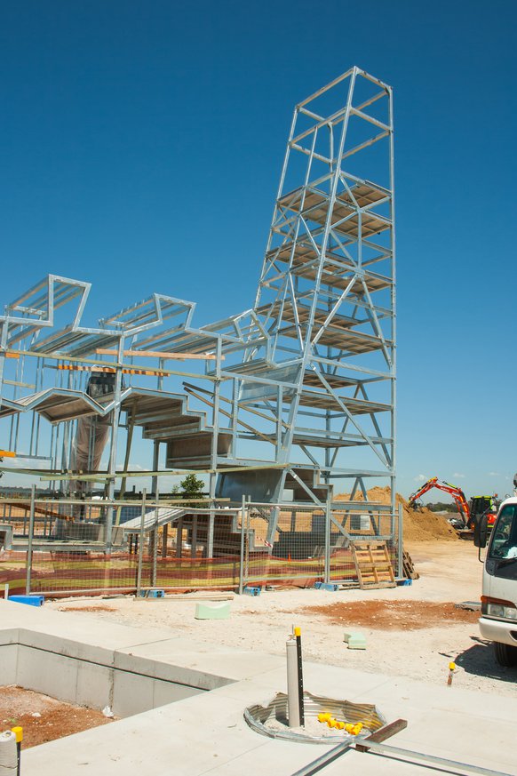新入口借鉴了周围景观的工业规模和语言,大型金属棚、超大街道标志和高速公路结构比比皆是。新公园通过新的入口框架在这个超大景观中有力地宣布了自己,它衡量并显示了两个新森林将增长到的体积。支撑框架讲述了游戏结构的结构语言和尚未建造的小溪交叉口。