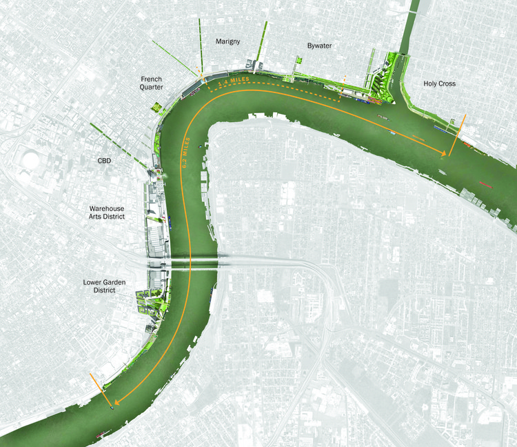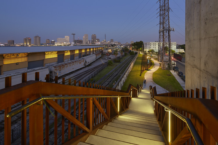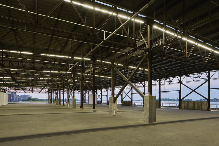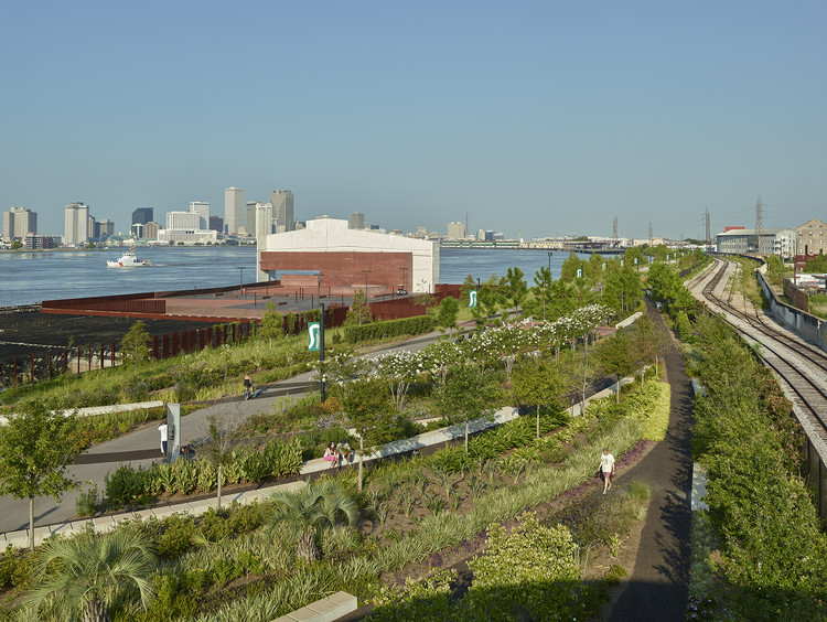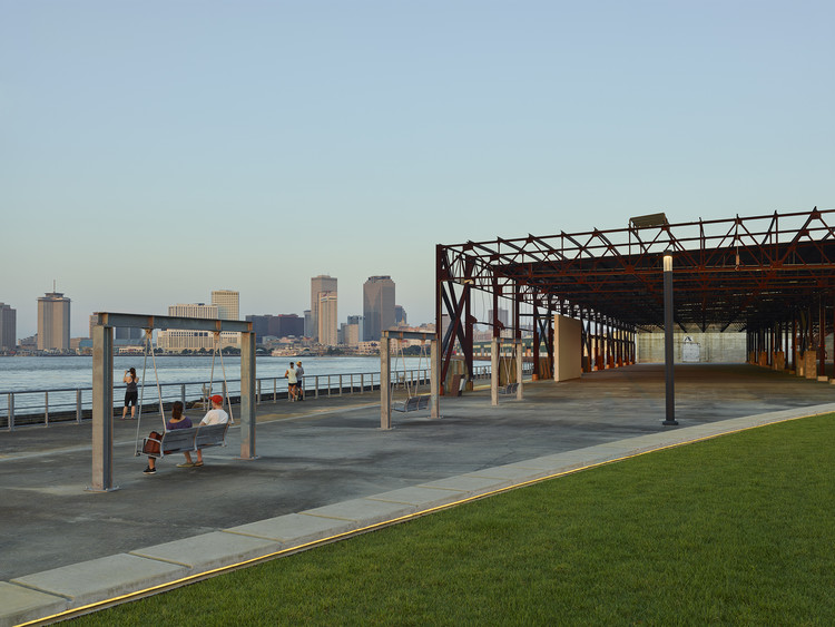 这是一个总长达1.4英里的长条形公园,其中有20英亩的景观绿地。在绿地间我们穿插设置了徒步道、慢跑道,还有自行车道;另外,还有专门的野餐区和遛狗区。 在原场地上的两个大型工业设施(PietyWharf和 Mandeville Shed),被我们改造成为适合举办公共聚会、节日庆典,以及艺术展览的实用空间。在尊重该场地工业历史特性的前提下,我们使用现代的技术重新诠释了这两个既有的工业建筑。原来这里是交通便捷的船运贸易枢纽,现在则被改造成为市民们聚集共享的重要枢纽。 这个改造项目不但恢复了曾被破坏的河滨生态环境,也使得新奥尔良市能更好践行世界级宜居城市的标准,为市民们提供了更优质的生活休闲设施。