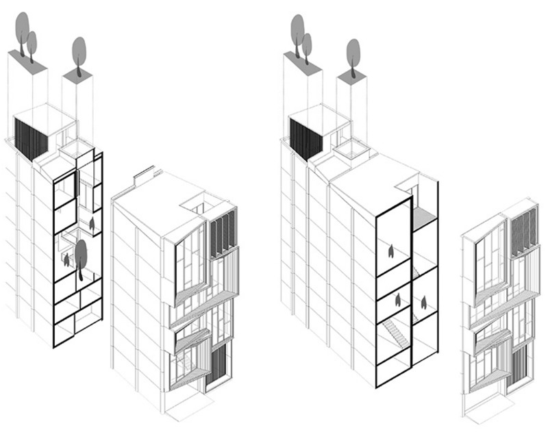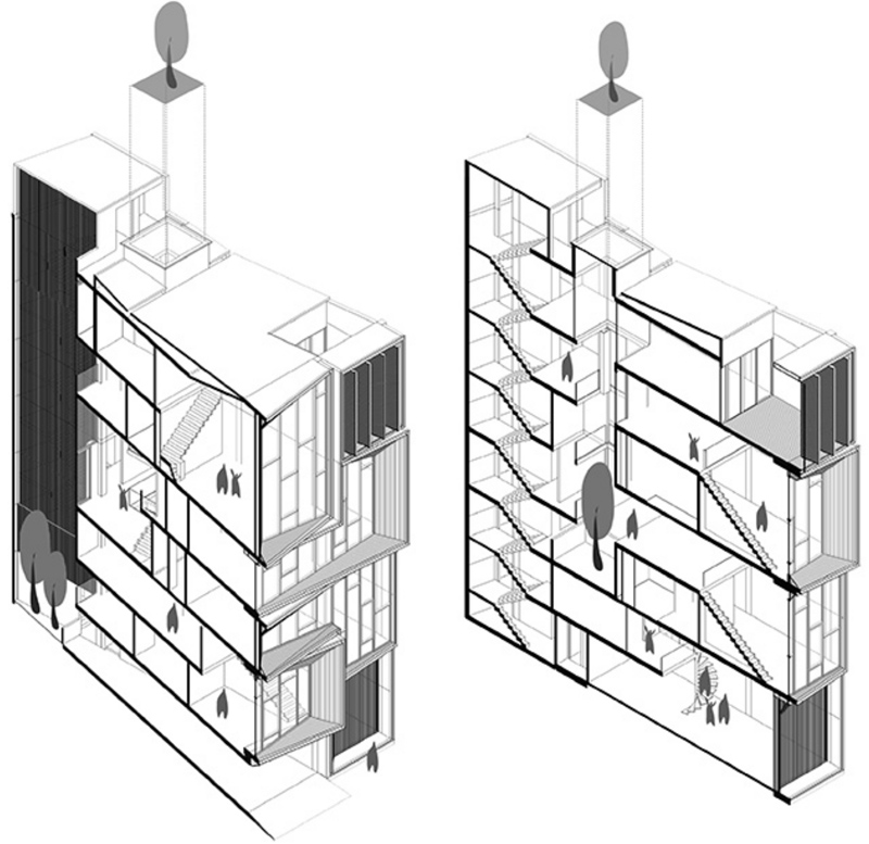 设计见图,反映了内部单元区域,以及本次旧建筑改造设计中的核心要素,垂直交通,底部与顶部的连接以及各个功能空间的咬合。