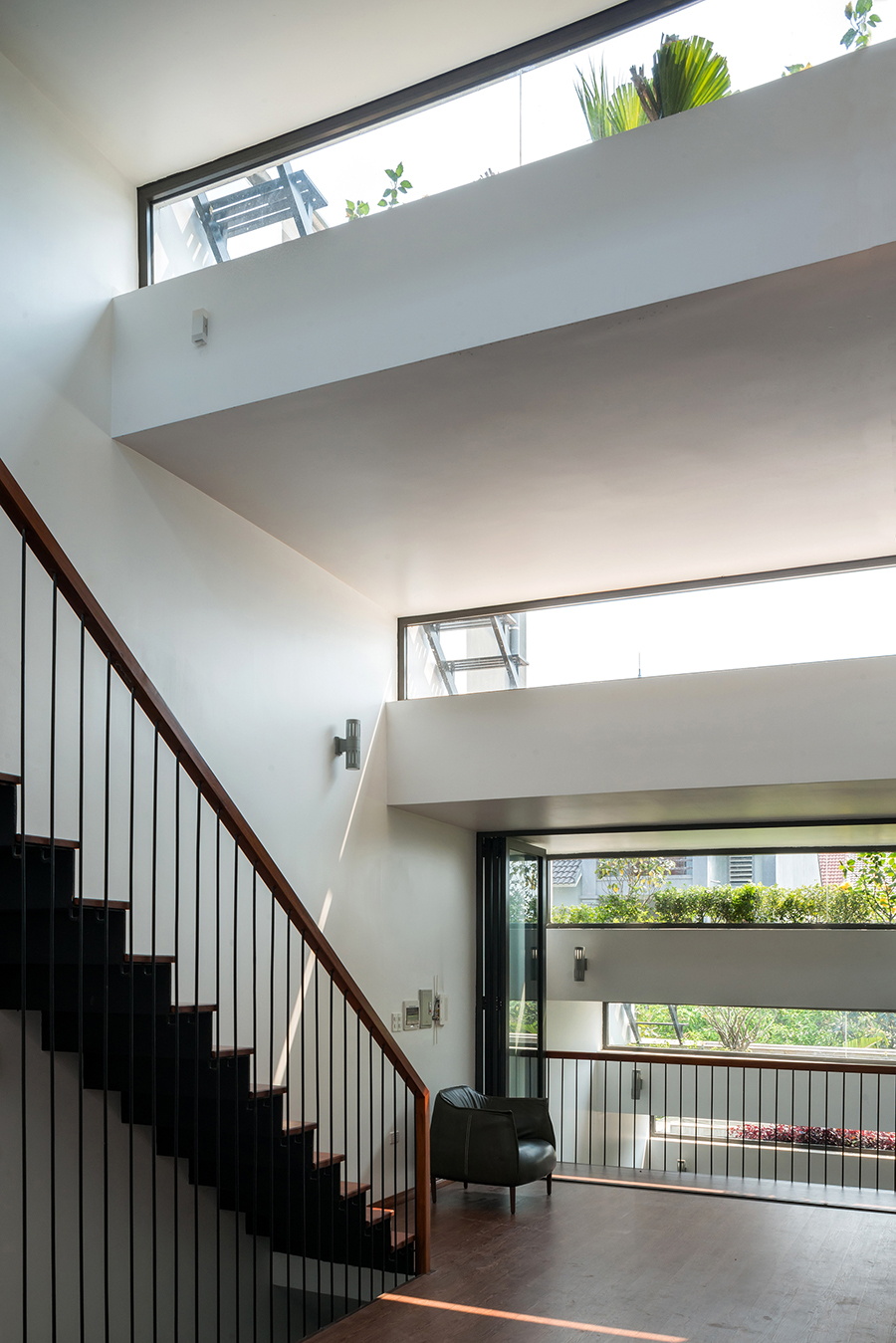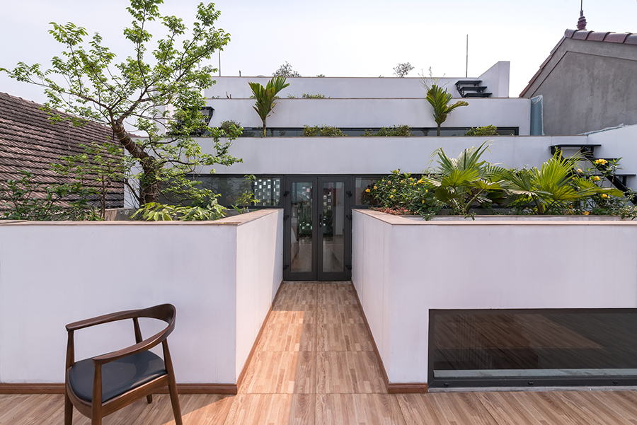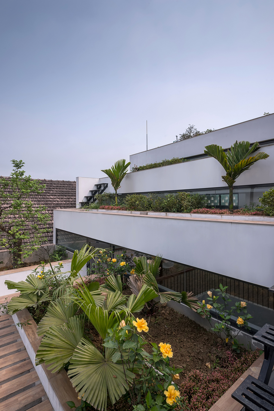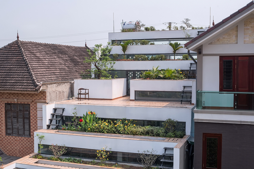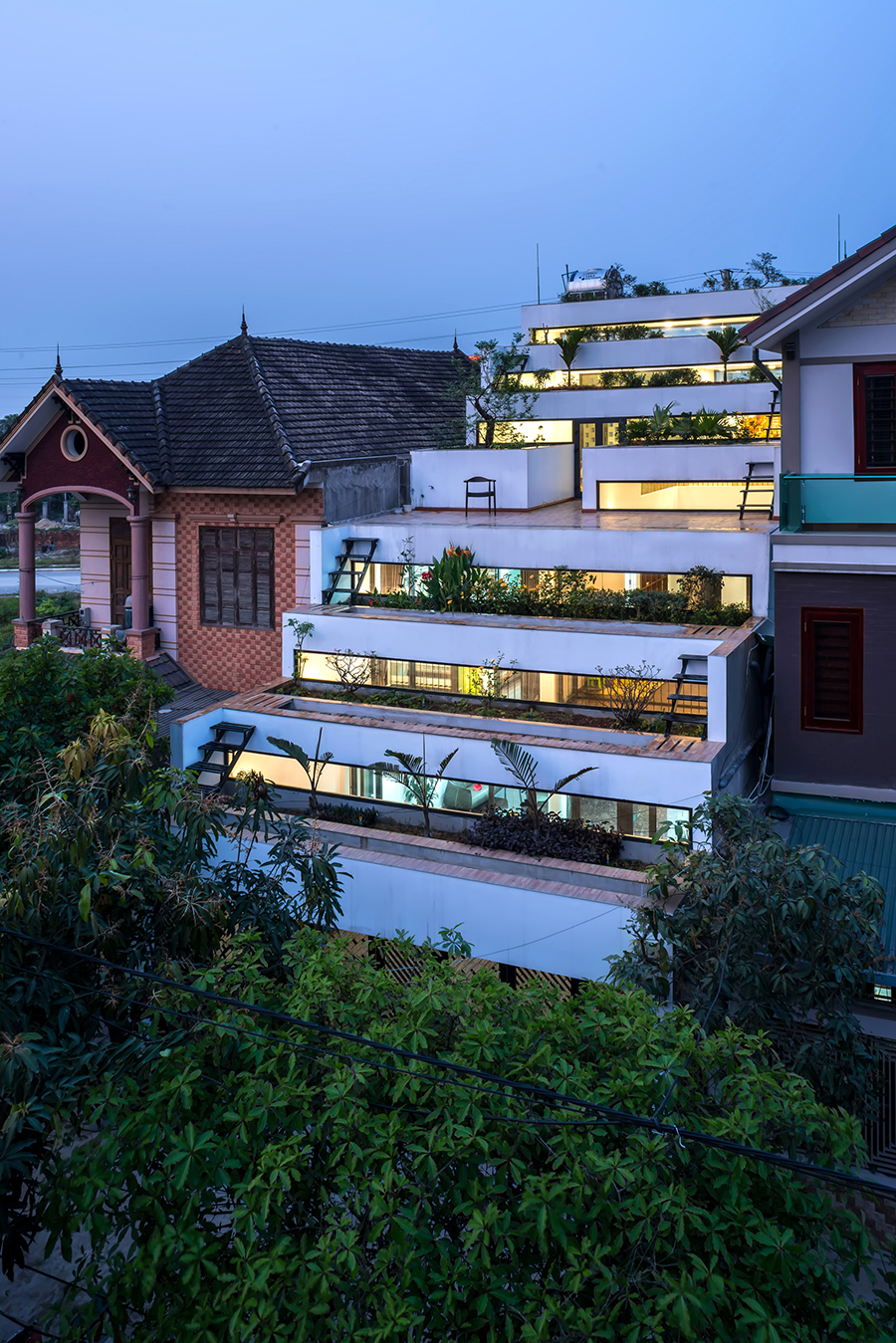在“梯田之家”(Teraces Home)中,他们将越南乡村生活的两种基本元素结合在了一起:居住需求与农耕传统转化为了水稻梯田造型的阶梯式建筑。热带季风的天气条件由坡顶的两个灌溉系统进行调节,从而让这里草木长青。