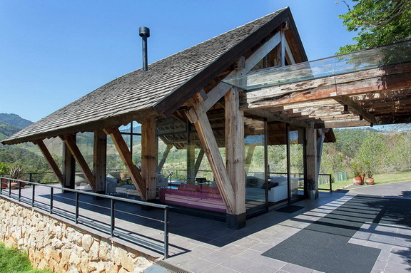 石头与木材的结合能够保持温暖的感觉,还能够让这种黄色色调保持一种细微的差别。因此,周围森林的绿色是唯一的其他颜色与其搭配的色调。由于巨大的玻璃幕墙的亮度和透明度,有着天然的绿色为背景的室内装饰设计因为其外面的景色而变得更加漂亮。