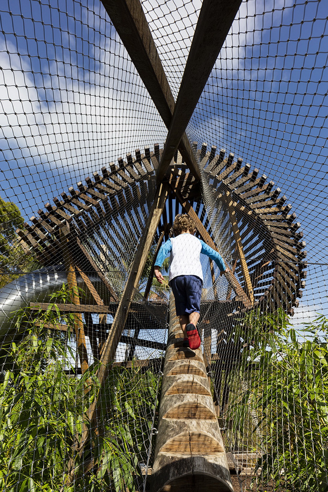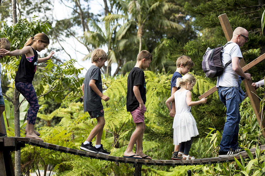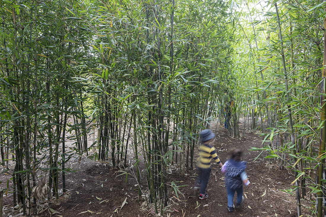 在野趣游乐公园内,孩子们可以跟随着自流的溪河和喷泉,找寻茂密的竹林,在如游动鳗鱼般的蜿蜒小径里探索无花果树林,或锻炼毅力,穿过平旋桥、攀爬树屋。