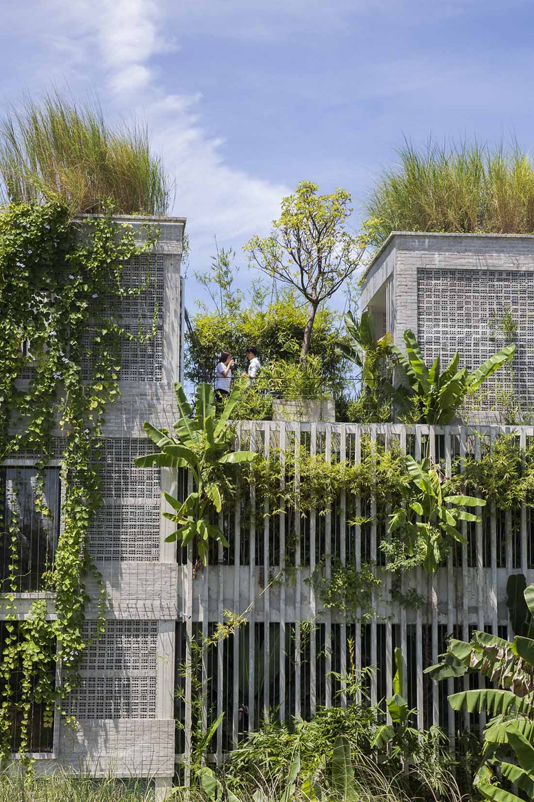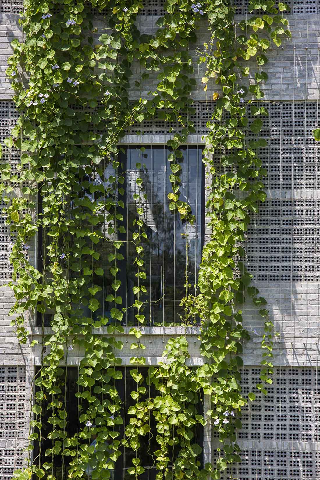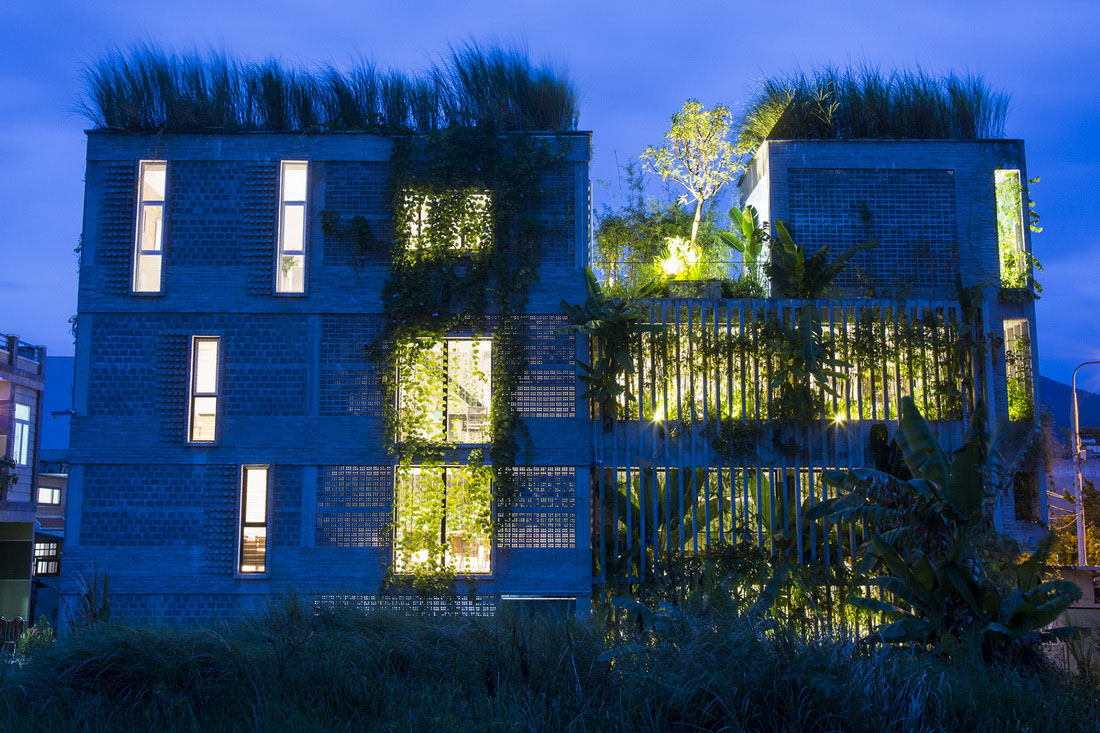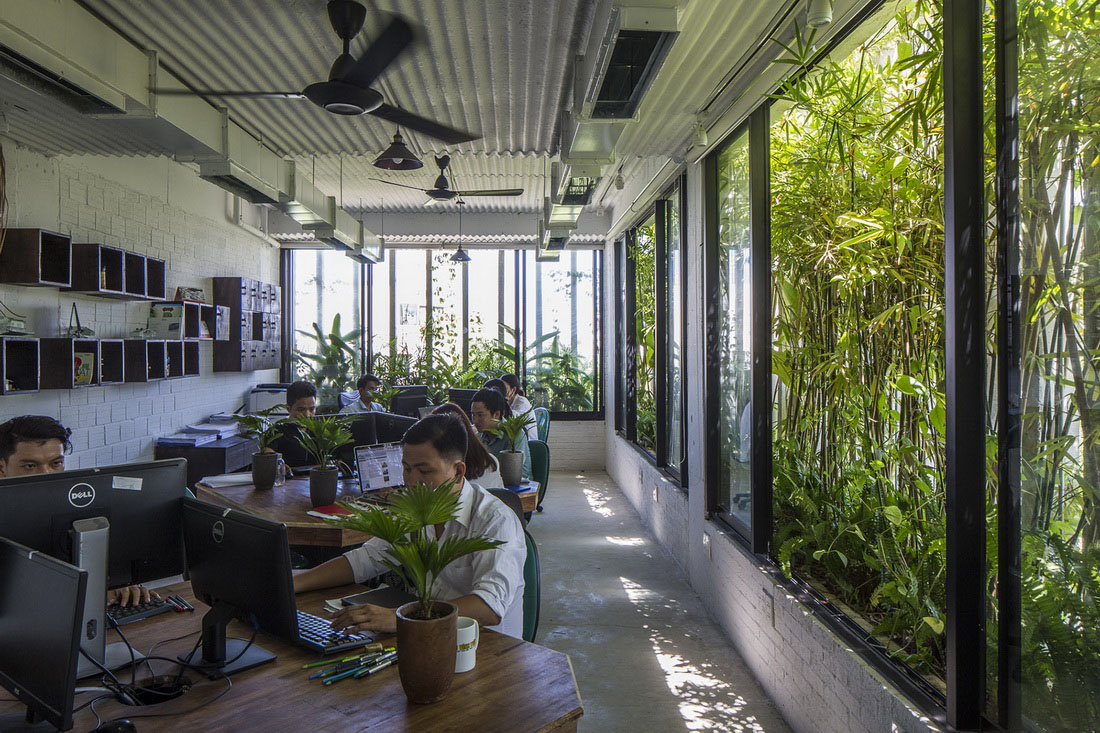 场地最初坐落着一些老旧的房屋,白色的蒲苇地,当地的小竹木,以及一些野生的植物。Ho Khue Architects希望通过设计唤起人们对原始乡土生活的记忆。在他们的设计下,这栋建筑矗立在当地绿植的环抱之下,让使用者在自然愉悦的办公环境之中。