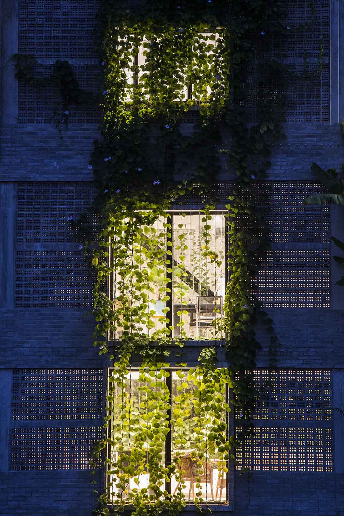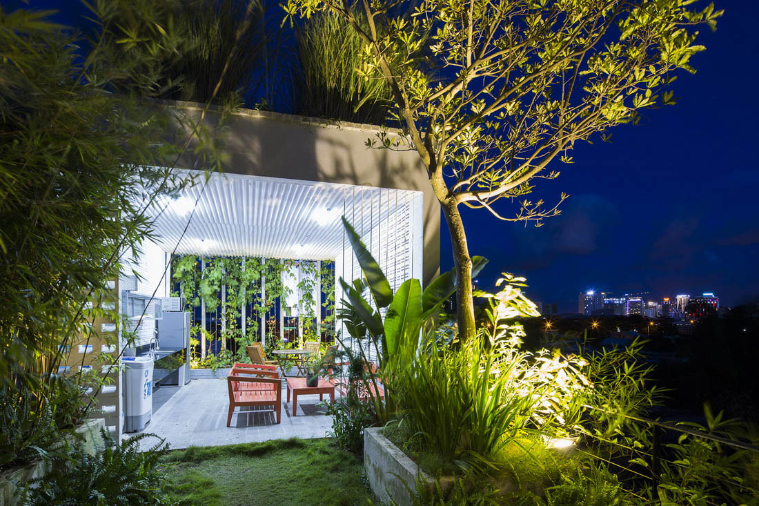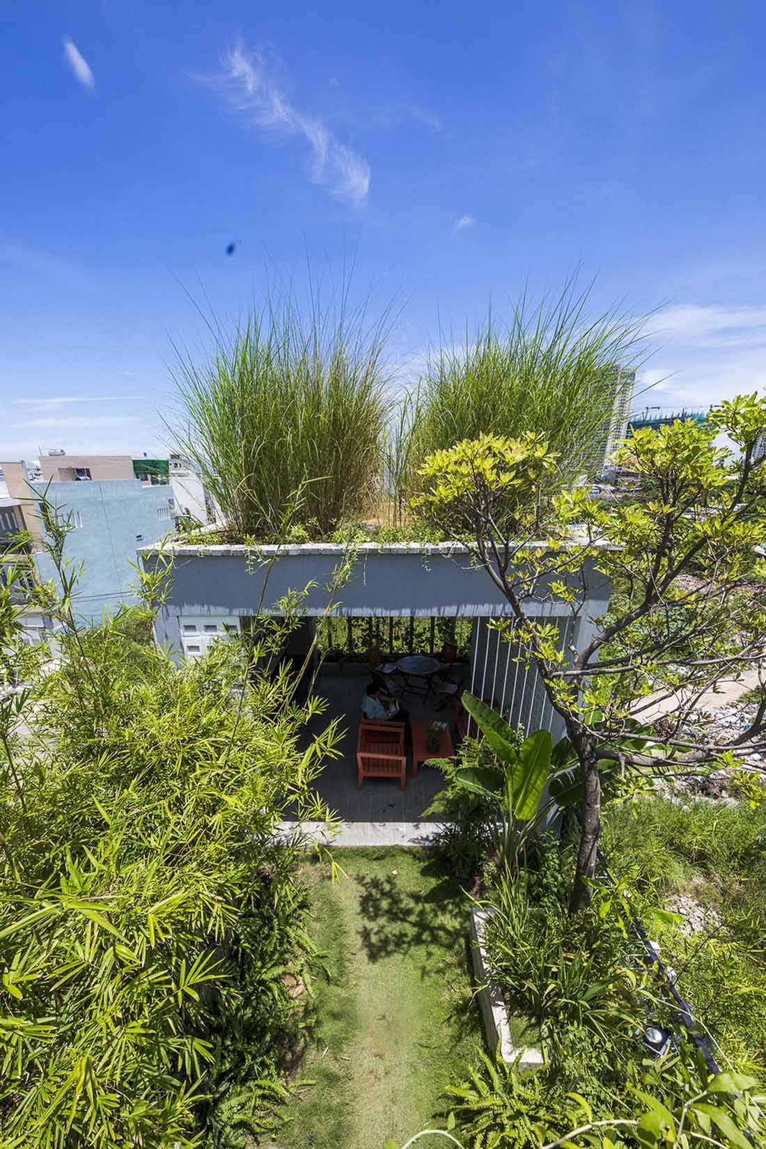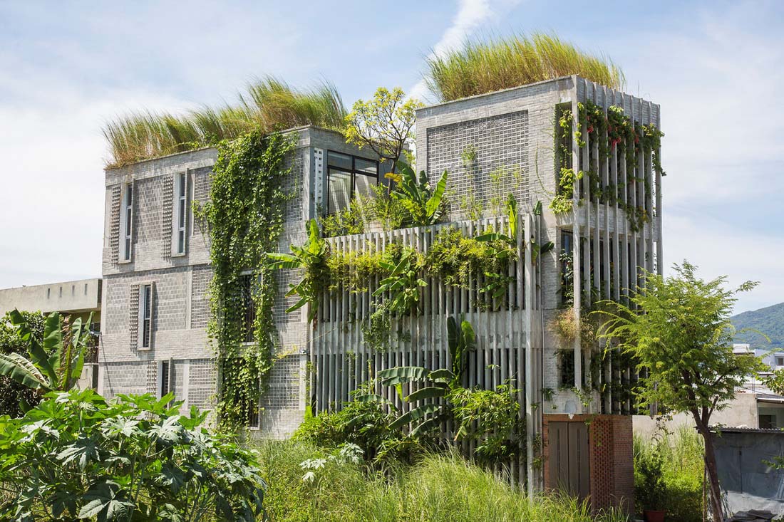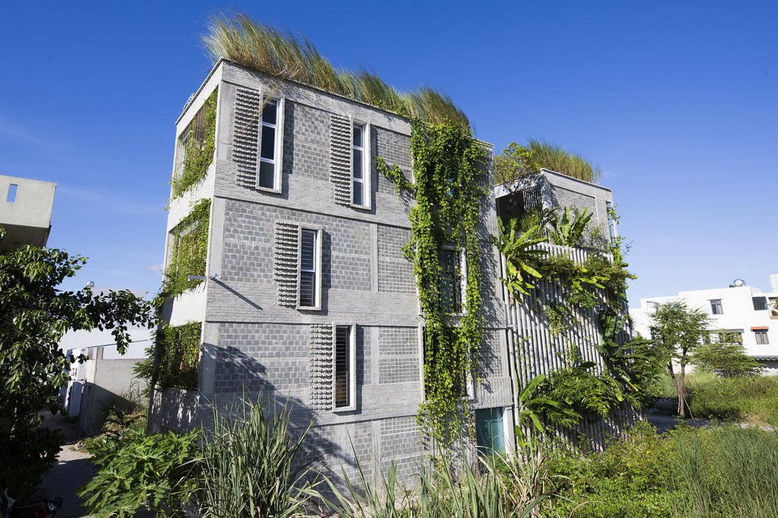 场地最初坐落着一些老旧的房屋,白色的蒲苇地,当地的小竹木,以及一些野生的植物。Ho Khue Architects希望通过设计唤起人们对原始乡土生活的记忆。在他们的设计下,这栋建筑矗立在当地绿植的环抱之下,让使用者在自然愉悦的办公环境之中。