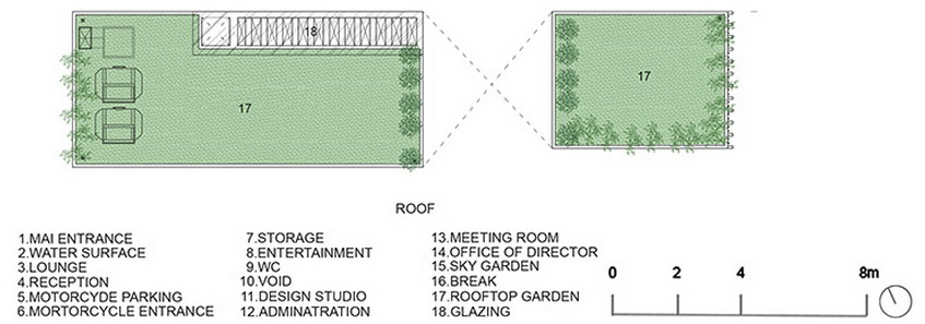 屋顶的草木众生为其下的室内空间营造凉爽的微气候。除此之外,公司的管理层,会客室以及巨大的开放式厨房和餐厅也位于此层。藤蔓植物攀爬于建筑之上,柔美了建筑外貌。专业的办公环境,自然的循环通风,优雅的绿植铺设和舒适的环境为员工和客户带来了独特的空间感受。